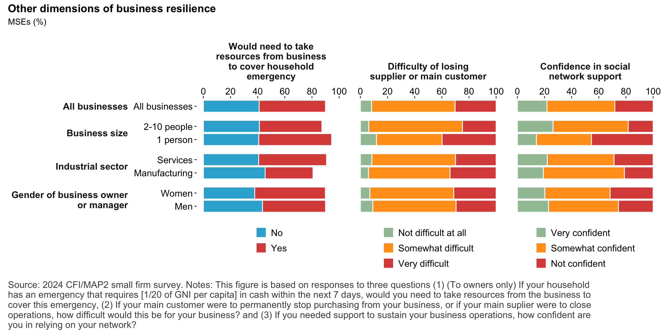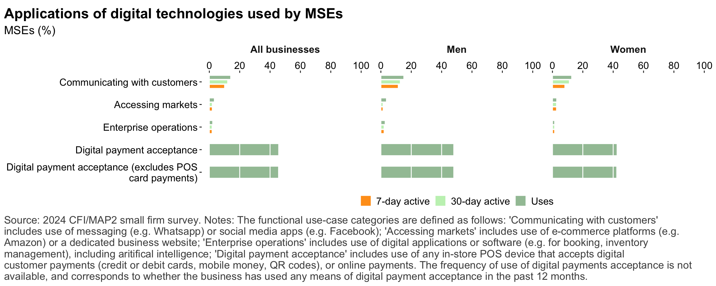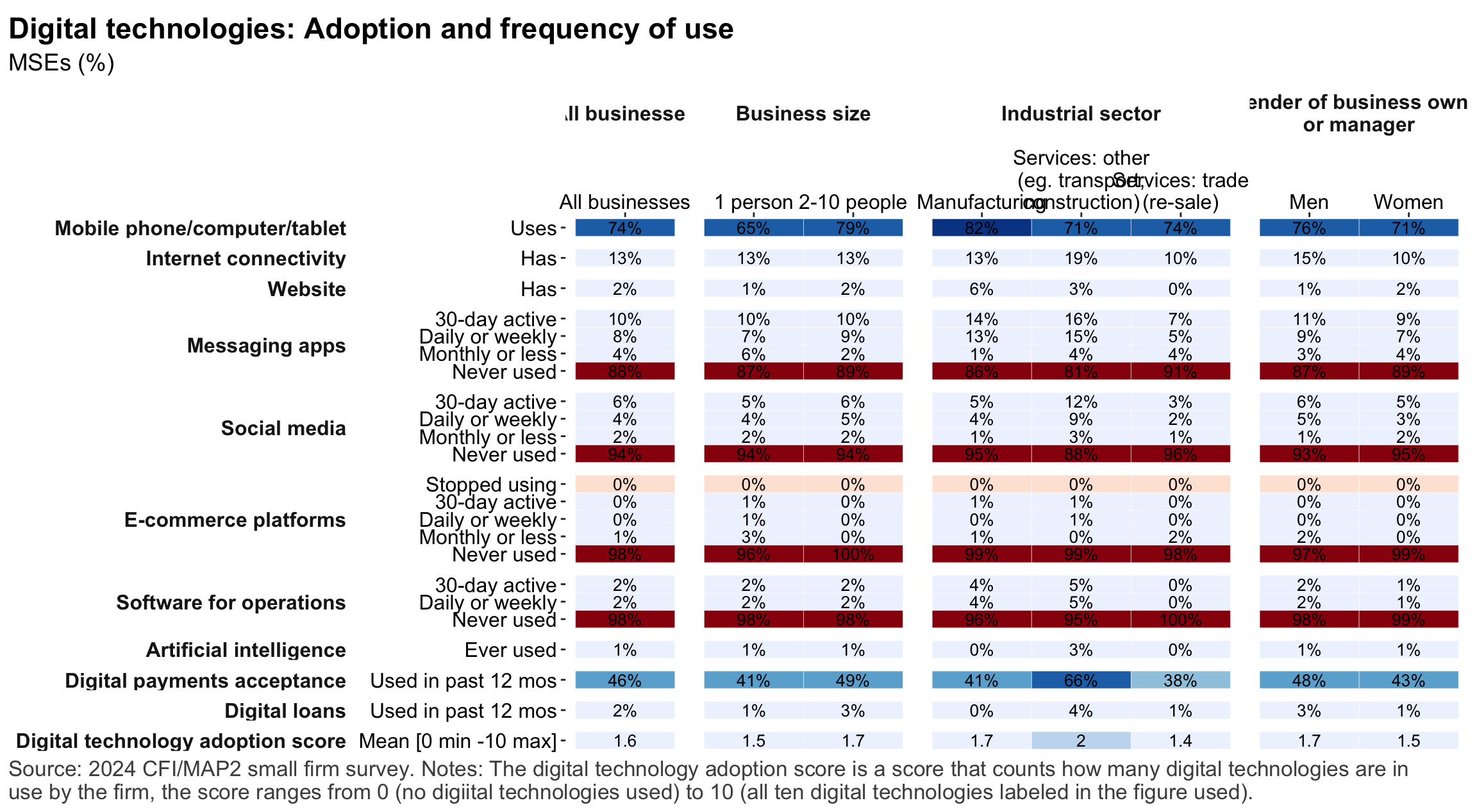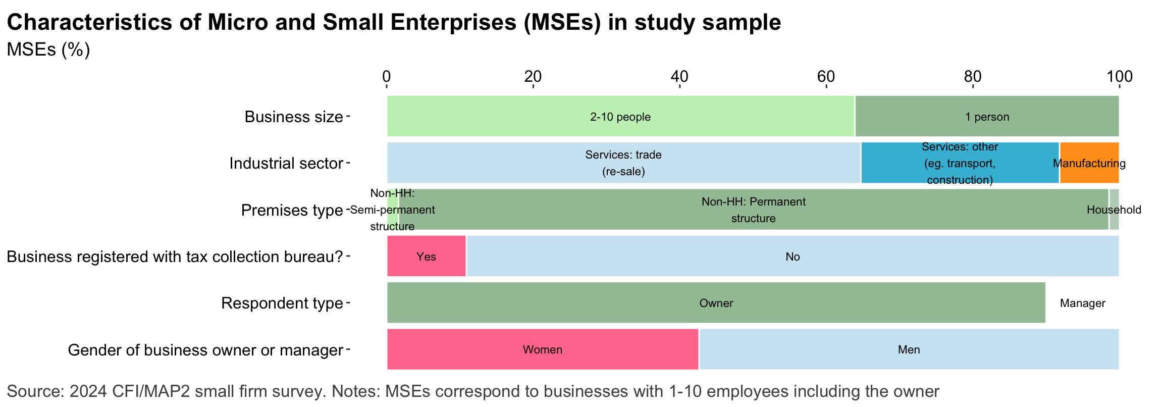 Figure 1: Geographic distribution of enumerated blocksFigure 2: Estimated business population by size and sectorFigure 3: MSE sample characteristicsFigure 4: MSEs by sector of productionFigure 5: MSE revenues and productivityFigure 6: Changes in MSE outcomes in past yearFigure 7: Gender composition of MSEs by sise and sectorFigure 8: MSE owner characteristicsFigure 9: Pyschographic characrteristics of SME owners or managers, by genderFigure 10: Correlation between owner’s motivations, goals and attitudes to riskFigure 11: Correlation between owner’s motivations, goals and attitudes to riskFigure 12: Relationship between owner’s gender and motivations, goals and attitudes to riskFigure 13: MSEs and codependence with owner’s householdFigure 14: Access to connectivity and devicesFigure 15: Predictors of digital technology adoptionFigure 16: Digital technology adoption by use caseFigure 17: Depth of digital technology adoptionFigure 18: Digital technology adoption factorsFigure 19: Relationship between internet-connectivity and firm-level labor productivityFigure 20: Relationship between digital technology and firm-level labor productivityFigure 21: Relationship between digital technology adoption and firm-level labor productivityFigure 22: Relationship between breadth of digital technology adoption and firm-level labor productivityFigure 23: Relationship between digital technology and financial resilienceFigure 24: Relationship between digital technology adoption and financial resilienceFigure 25: Financical accounts and savingsFigure 26: Merchant paymentsFigure 27: Demand for creditFigure 28: Barriers to creditFigure 29: Impacts of digital financial servicesFigure 30: Insurance usageFigure 31: Relationship between financial services and firm-level labor productivityFigure 32: Relationship between financial services and financial resilienceFigure 33: Challenges with loan repaymentFigure 34: Consumer protection issuesFigure 35: Risks: GeneralFigure 36: Risks: ClimateFigure 37: Risks: ImpactsFigure 38: Financial resilienceFigure 39: Other dimensions of business resilienceFigure 40: Resilience capital