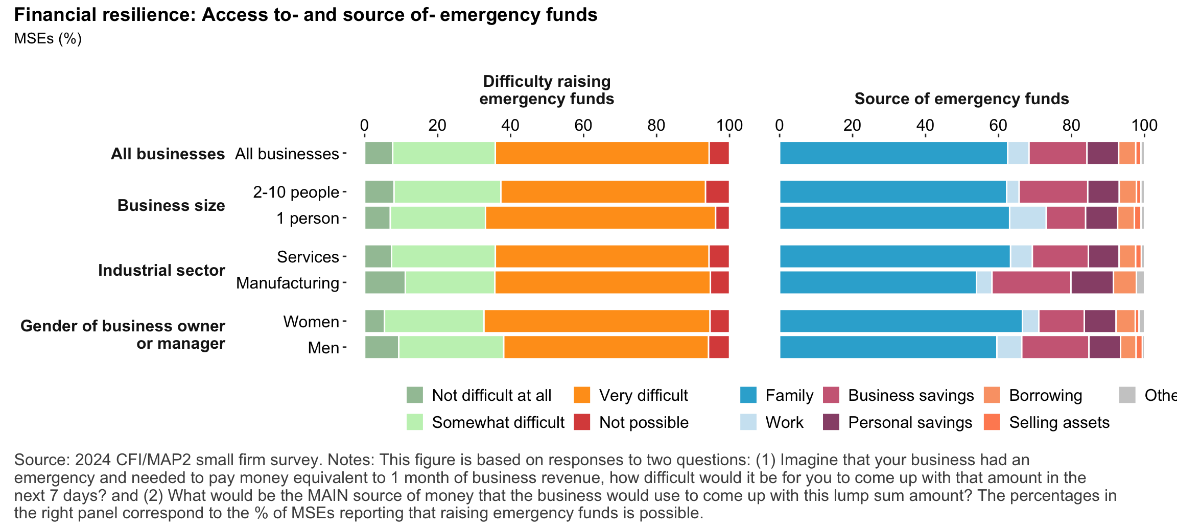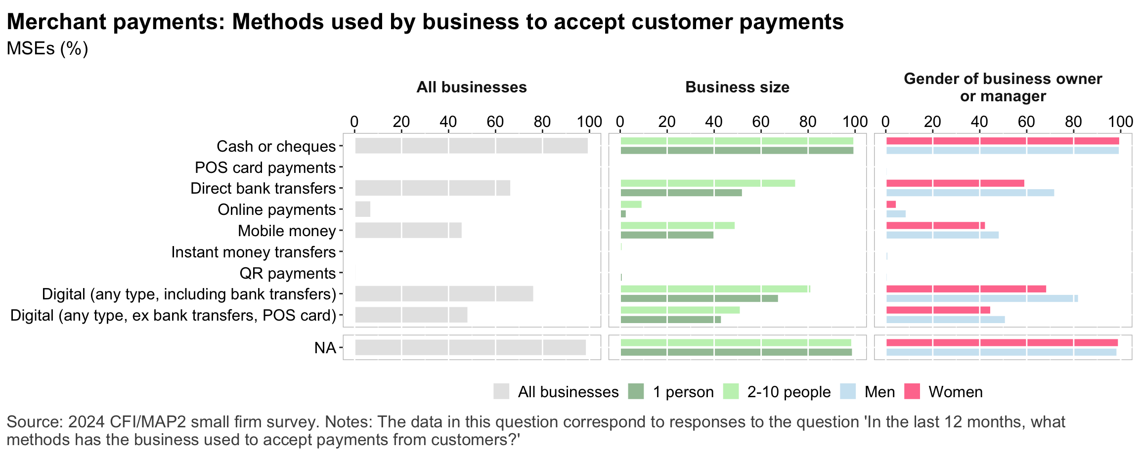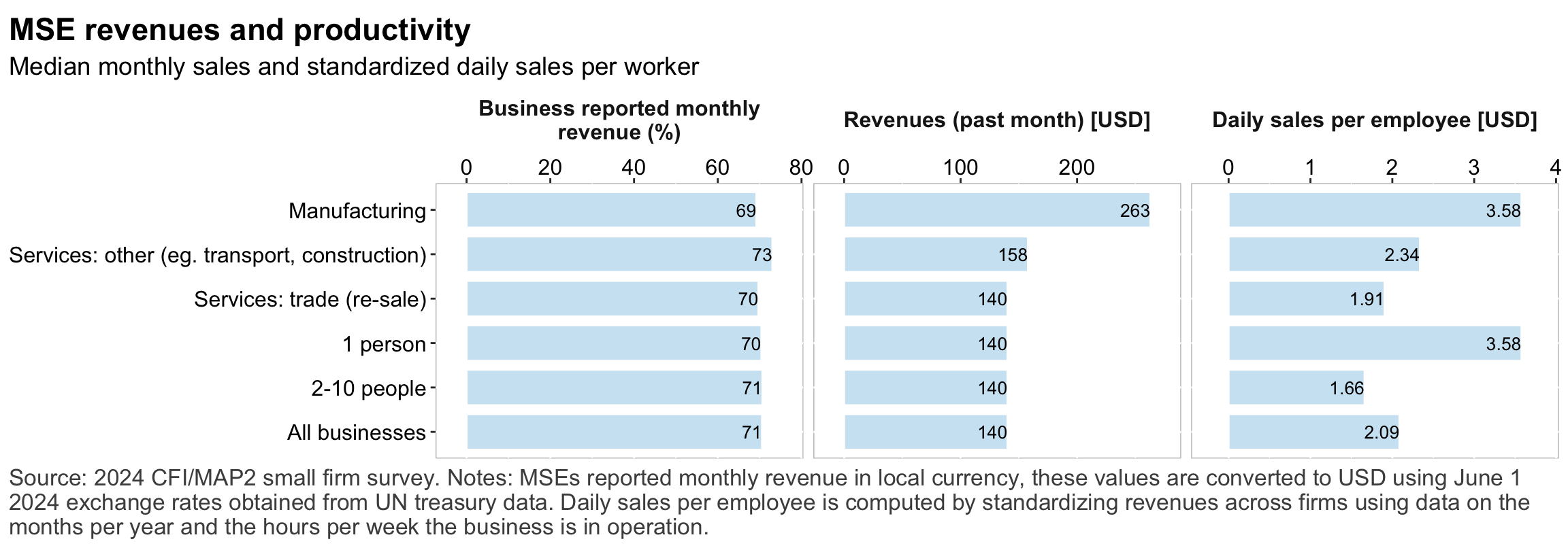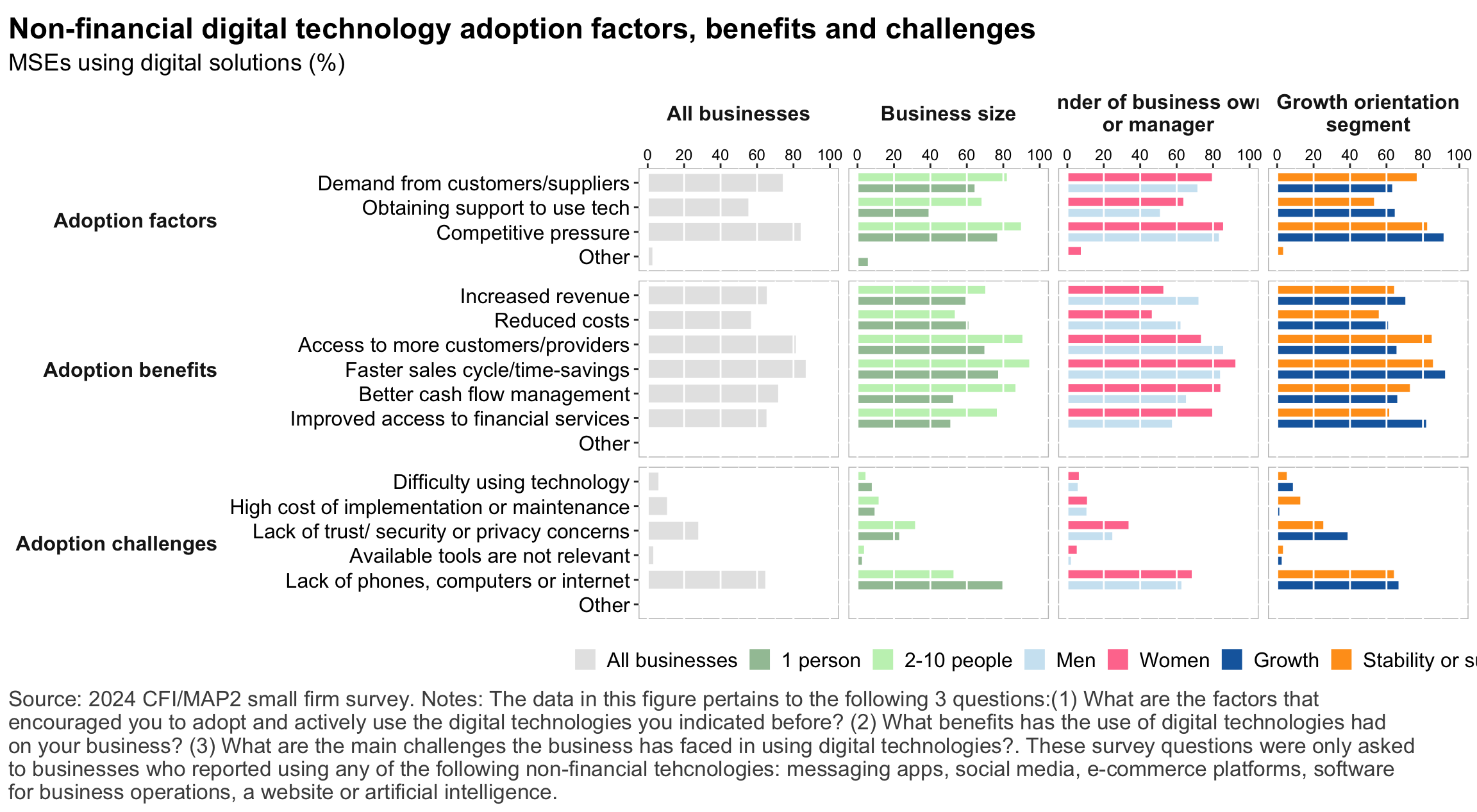 Figure 1: Geographic distribution of enumerated blocksFigure 2: Estimated business population by size and sectorFigure 3: MSE sample characteristicsFigure 4: MSEs by sector of productionFigure 5: MSE revenues and productivityFigure 6: Changes in MSE outcomes in past yearFigure 7: Gender composition of MSEs by sise and sectorFigure 8: MSE owner characteristicsFigure 9: Pyschographic characrteristics of SME owners or managers, by genderFigure 10: Correlation between owner’s motivations, goals and attitudes to riskFigure 11: Correlation between owner’s motivations, goals and attitudes to riskFigure 12: Relationship between owner’s gender and motivations, goals and attitudes to riskFigure 13: MSEs and codependence with owner’s householdFigure 14: Access to connectivity and devicesFigure 15: Predictors of digital technology adoptionFigure 16: Digital technology adoption by use caseFigure 17: Depth of digital technology adoptionFigure 18: Digital technology adoption factorsFigure 19: Relationship between internet-connectivity and firm-level labor productivityFigure 20: Relationship between digital technology and firm-level labor productivityFigure 21: Relationship between digital technology adoption and firm-level labor productivityFigure 22: Relationship between breadth of digital technology adoption and firm-level labor productivityFigure 23: Relationship between digital technology and financial resilienceFigure 24: Relationship between digital technology adoption and financial resilienceFigure 25: Financical accounts and savingsFigure 26: Merchant paymentsFigure 27: Demand for creditFigure 28: Barriers to creditFigure 29: Impacts of digital financial servicesFigure 30: Insurance usageFigure 31: Relationship between financial services and firm-level labor productivityFigure 32: Relationship between financial services and financial resilienceFigure 33: Challenges with loan repaymentFigure 34: Consumer protection issuesFigure 35: Risks: GeneralFigure 36: Risks: ClimateFigure 37: Risks: ImpactsFigure 38: Financial resilienceFigure 39: Other dimensions of business resilienceFigure 40: Resilience capital