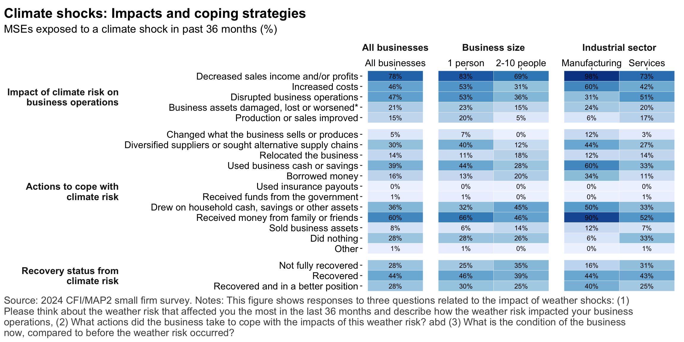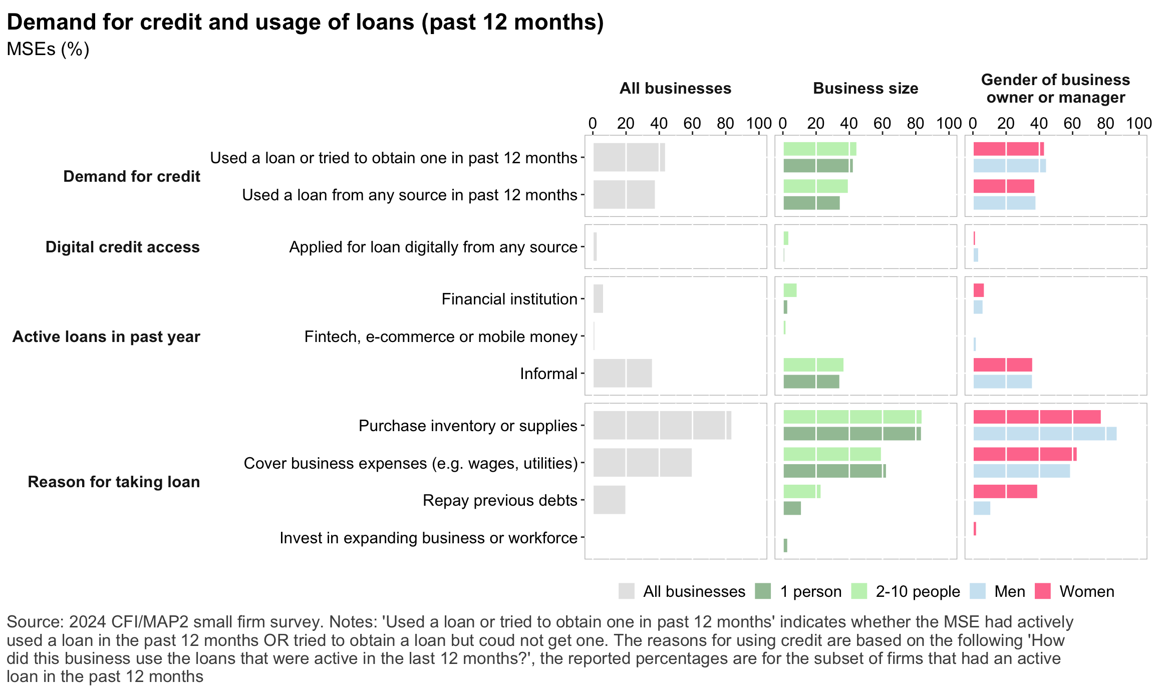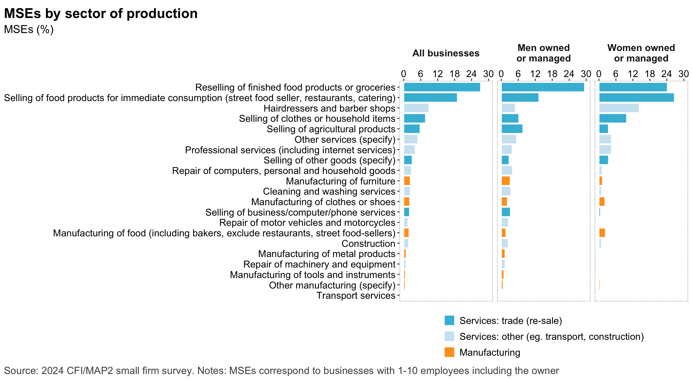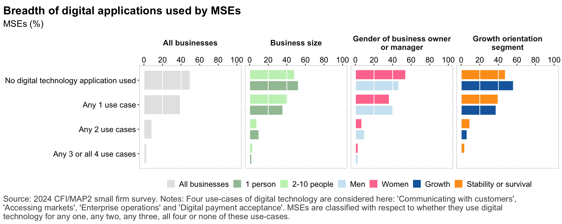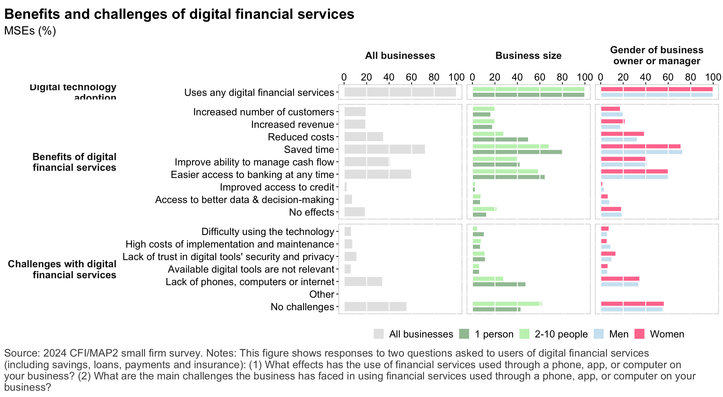 Figure 1: Geographic distribution of enumerated blocksFigure 2: Estimated business population by size and sectorFigure 3: MSE sample characteristicsFigure 4: MSEs by sector of productionFigure 5: MSE revenues and productivityFigure 6: Changes in MSE outcomes in past yearFigure 7: Gender composition of MSEs by sise and sectorFigure 8: MSE owner characteristicsFigure 9: Pyschographic characrteristics of SME owners or managers, by genderFigure 10: Correlation between owner’s motivations, goals and attitudes to riskFigure 11: Correlation between owner’s motivations, goals and attitudes to riskFigure 12: Relationship between owner’s gender and motivations, goals and attitudes to riskFigure 13: MSEs and codependence with owner’s householdFigure 14: Access to connectivity and devicesFigure 15: Predictors of digital technology adoptionFigure 16: Digital technology adoption by use caseFigure 17: Depth of digital technology adoptionFigure 18: Digital technology adoption factorsFigure 19: Relationship between internet-connectivity and firm-level labor productivityFigure 20: Relationship between digital technology and firm-level labor productivityFigure 21: Relationship between digital technology adoption and firm-level labor productivityFigure 22: Relationship between breadth of digital technology adoption and firm-level labor productivityFigure 23: Relationship between digital technology and financial resilienceFigure 24: Relationship between digital technology adoption and financial resilienceFigure 25: Financical accounts and savingsFigure 26: Merchant paymentsFigure 27: Demand for creditFigure 28: Barriers to creditFigure 29: Impacts of digital financial servicesFigure 30: Insurance usageFigure 31: Relationship between financial services and firm-level labor productivityFigure 32: Relationship between financial services and financial resilienceFigure 33: Challenges with loan repaymentFigure 34: Consumer protection issuesFigure 35: Risks: GeneralFigure 36: Risks: ClimateFigure 37: Risks: ImpactsFigure 38: Financial resilienceFigure 39: Other dimensions of business resilienceFigure 40: Resilience capital