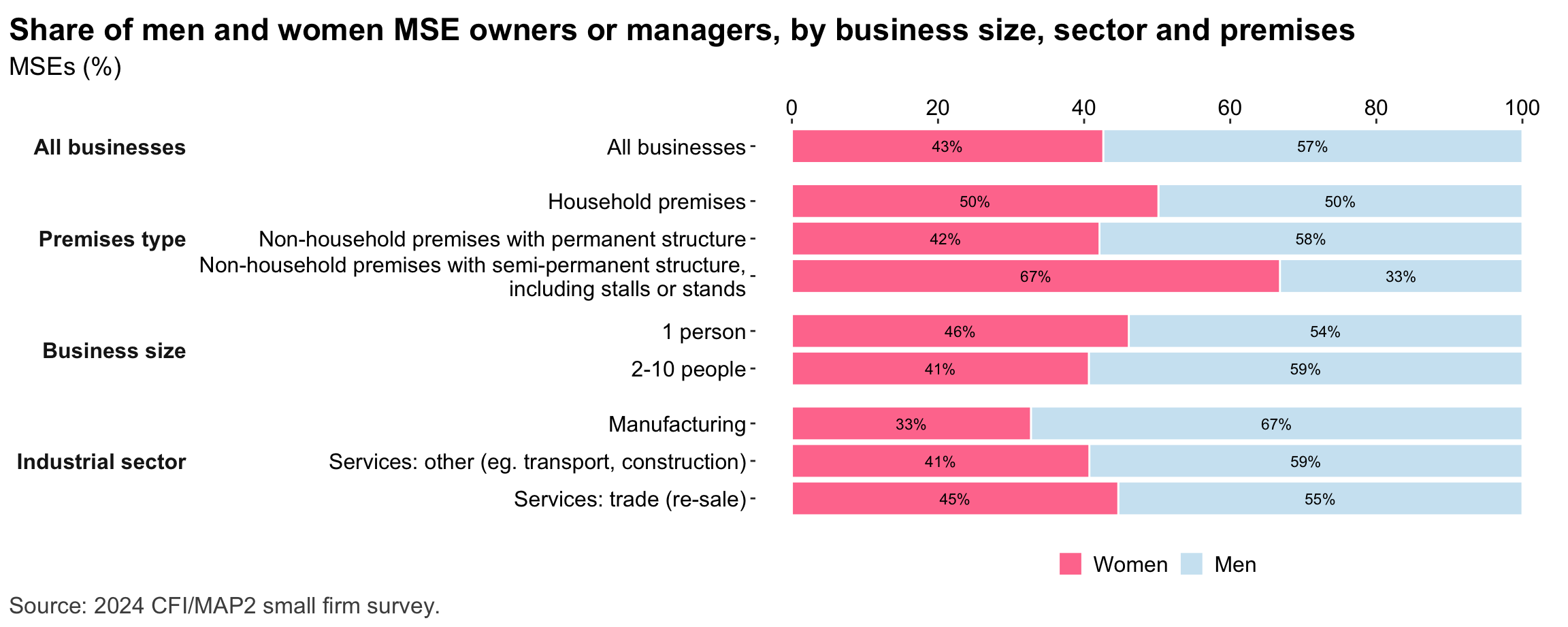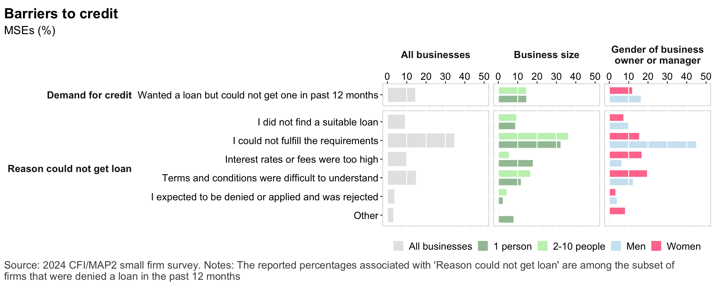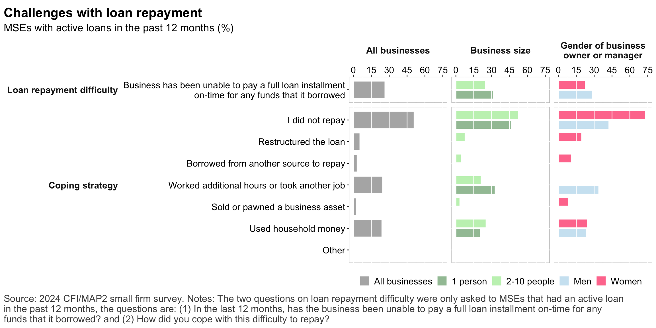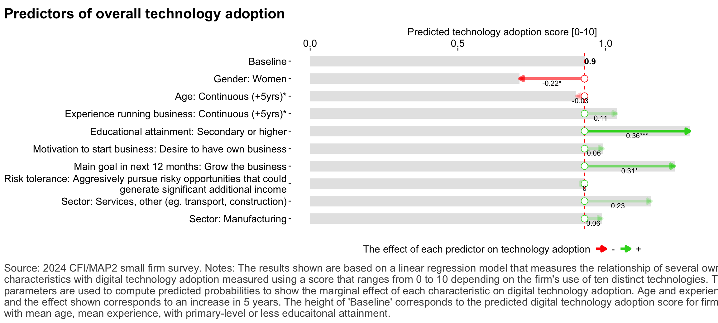 Figure 1: Geographic distribution of enumerated blocksFigure 2: Estimated business population by size and sectorFigure 3: MSE sample characteristicsFigure 4: MSEs by sector of productionFigure 5: MSE revenues and productivityFigure 6: Changes in MSE outcomes in past yearFigure 7: Gender composition of MSEs by sise and sectorFigure 8: MSE owner characteristicsFigure 9: Pyschographic characrteristics of SME owners or managers, by genderFigure 10: Correlation between owner’s motivations, goals and attitudes to riskFigure 11: Correlation between owner’s motivations, goals and attitudes to riskFigure 12: Relationship between owner’s gender and motivations, goals and attitudes to riskFigure 13: MSEs and codependence with owner’s householdFigure 14: Access to connectivity and devicesFigure 15: Predictors of digital technology adoptionFigure 16: Digital technology adoption by use caseFigure 17: Depth of digital technology adoptionFigure 18: Digital technology adoption factorsFigure 19: Relationship between internet-connectivity and firm-level labor productivityFigure 20: Relationship between digital technology and firm-level labor productivityFigure 21: Relationship between digital technology adoption and firm-level labor productivityFigure 22: Relationship between breadth of digital technology adoption and firm-level labor productivityFigure 23: Relationship between digital technology and financial resilienceFigure 24: Relationship between digital technology adoption and financial resilienceFigure 25: Financical accounts and savingsFigure 26: Merchant paymentsFigure 27: Demand for creditFigure 28: Barriers to creditFigure 29: Impacts of digital financial servicesFigure 30: Insurance usageFigure 31: Relationship between financial services and firm-level labor productivityFigure 32: Relationship between financial services and financial resilienceFigure 33: Challenges with loan repaymentFigure 34: Consumer protection issuesFigure 35: Risks: GeneralFigure 36: Risks: ClimateFigure 37: Risks: ImpactsFigure 38: Financial resilienceFigure 39: Other dimensions of business resilienceFigure 40: Resilience capital