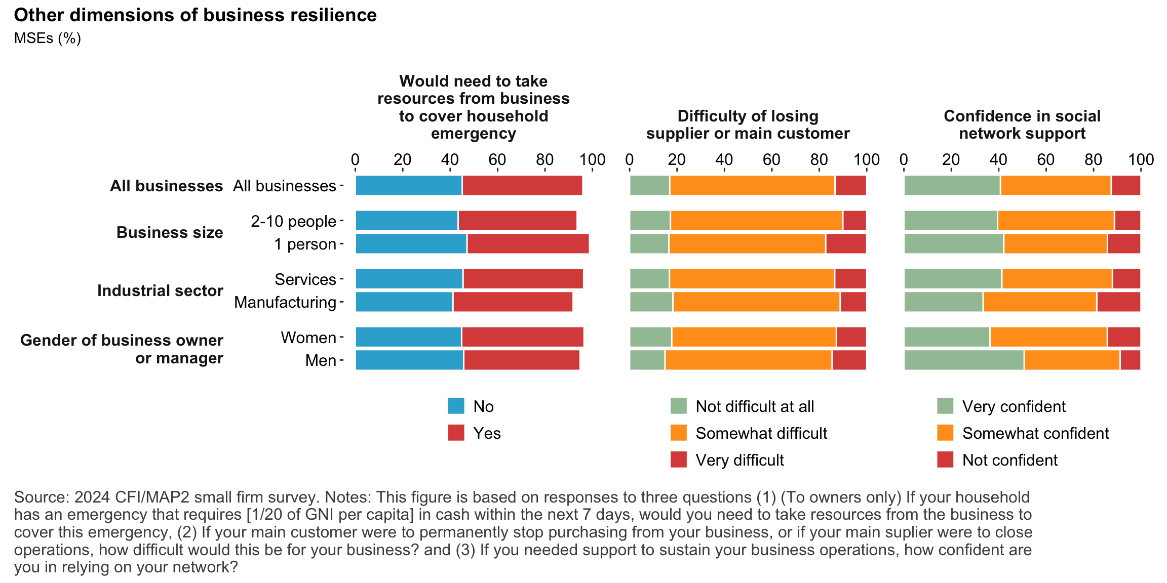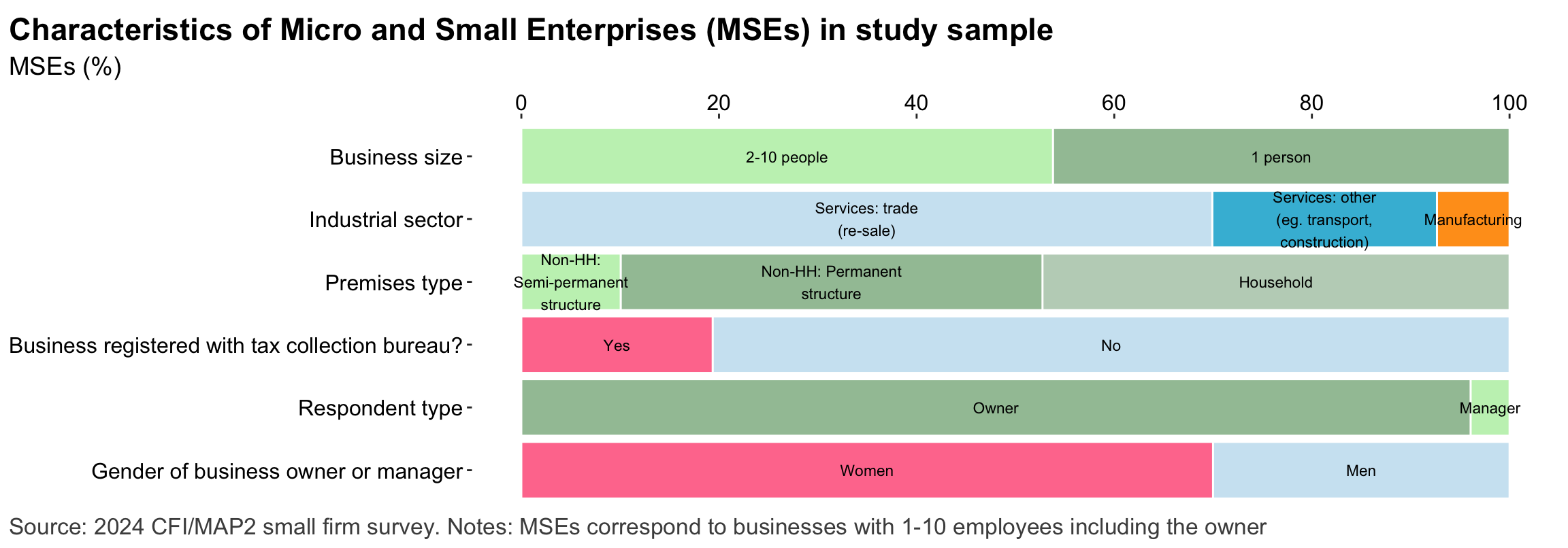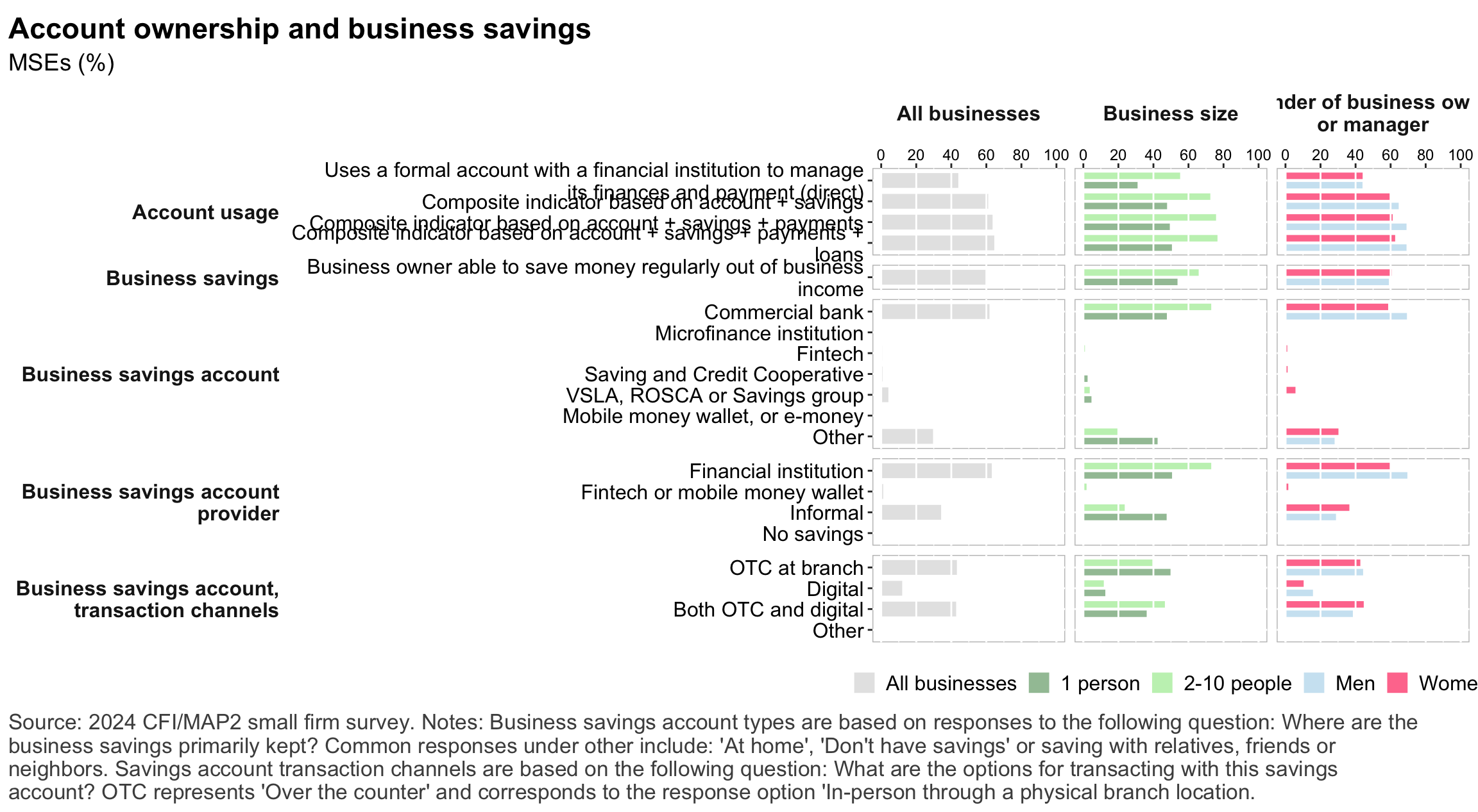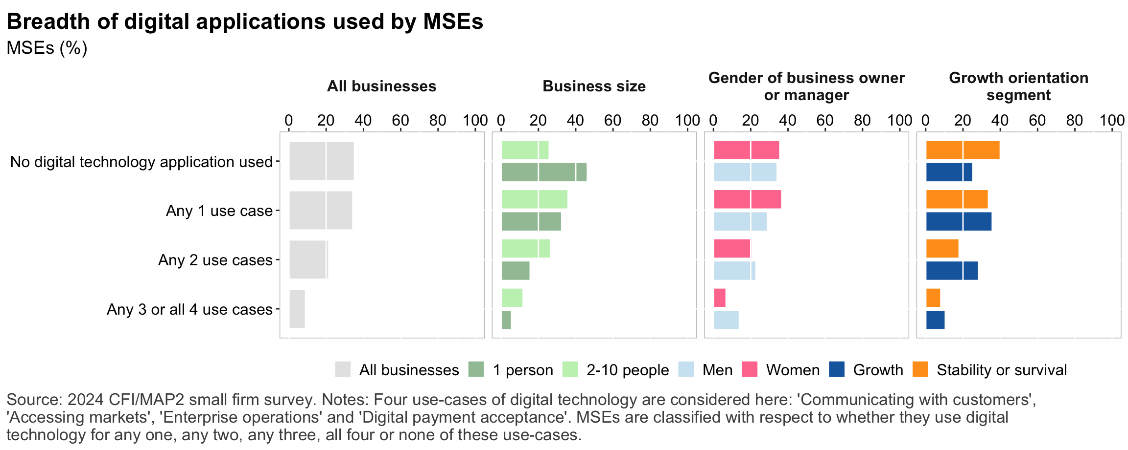 Figure 1: Geographic distribution of enumerated blocksFigure 2: Estimated business population by size and sectorFigure 3: MSE sample characteristicsFigure 4: MSEs by sector of productionFigure 5: MSE revenues and productivityFigure 6: Changes in MSE outcomes in past yearFigure 7: Gender composition of MSEs by sise and sectorFigure 8: MSE owner characteristicsFigure 9: Pyschographic characrteristics of SME owners or managers, by genderFigure 10: Correlation between owner’s motivations, goals and attitudes to riskFigure 11: Correlation between owner’s motivations, goals and attitudes to riskFigure 12: Relationship between owner’s gender and motivations, goals and attitudes to riskFigure 13: MSEs and codependence with owner’s householdFigure 14: Access to connectivity and devicesFigure 15: Predictors of digital technology adoptionFigure 16: Digital technology adoption by use caseFigure 17: Depth of digital technology adoptionFigure 18: Digital technology adoption factorsFigure 19: Relationship between internet-connectivity and firm-level labor productivityFigure 20: Relationship between digital technology and firm-level labor productivityFigure 21: Relationship between digital technology adoption and firm-level labor productivityFigure 22: Relationship between breadth of digital technology adoption and firm-level labor productivityFigure 23: Relationship between digital technology and financial resilienceFigure 24: Relationship between digital technology adoption and financial resilienceFigure 25: Financical accounts and savingsFigure 26: Merchant paymentsFigure 27: Demand for creditFigure 28: Barriers to creditFigure 29: Impacts of digital financial servicesFigure 30: Insurance usageFigure 31: Relationship between financial services and firm-level labor productivityFigure 32: Relationship between financial services and financial resilienceFigure 33: Challenges with loan repaymentFigure 34: Consumer protection issuesFigure 35: Risks: GeneralFigure 36: Risks: ClimateFigure 37: Risks: ImpactsFigure 38: Financial resilienceFigure 39: Other dimensions of business resilienceFigure 40: Resilience capital