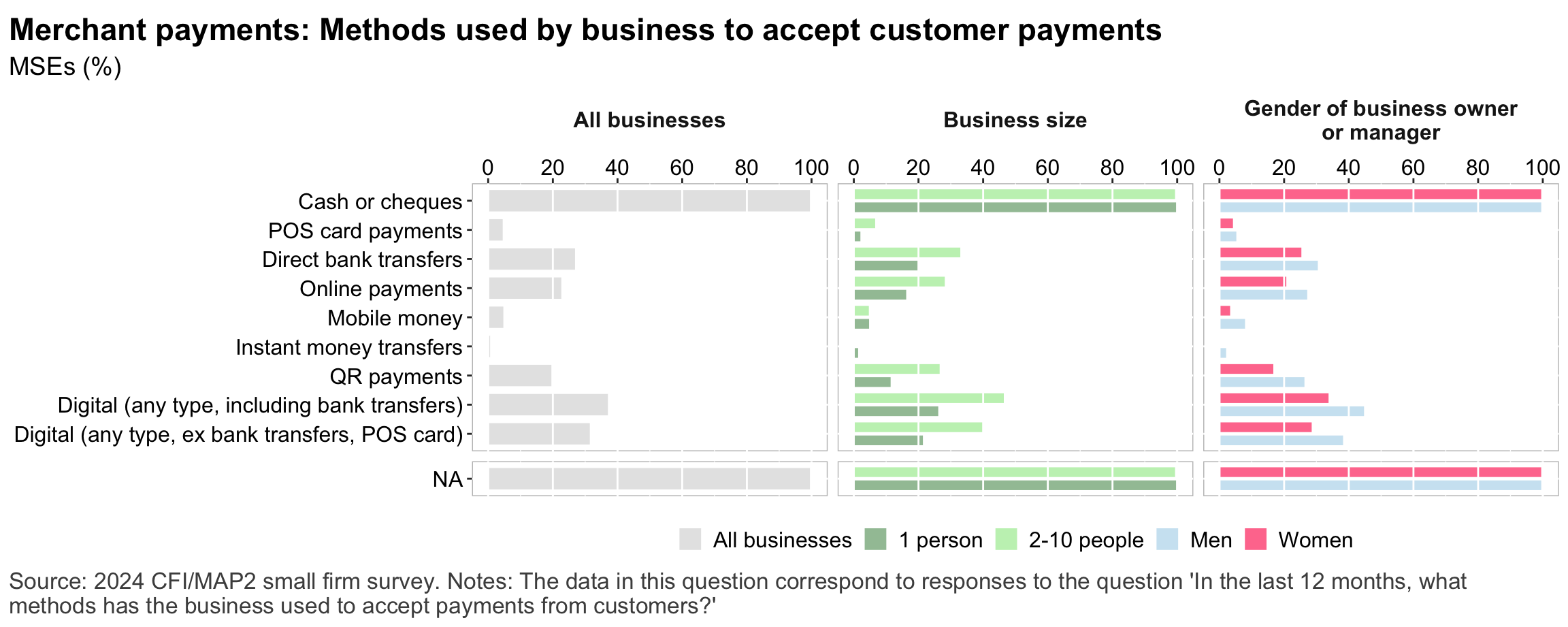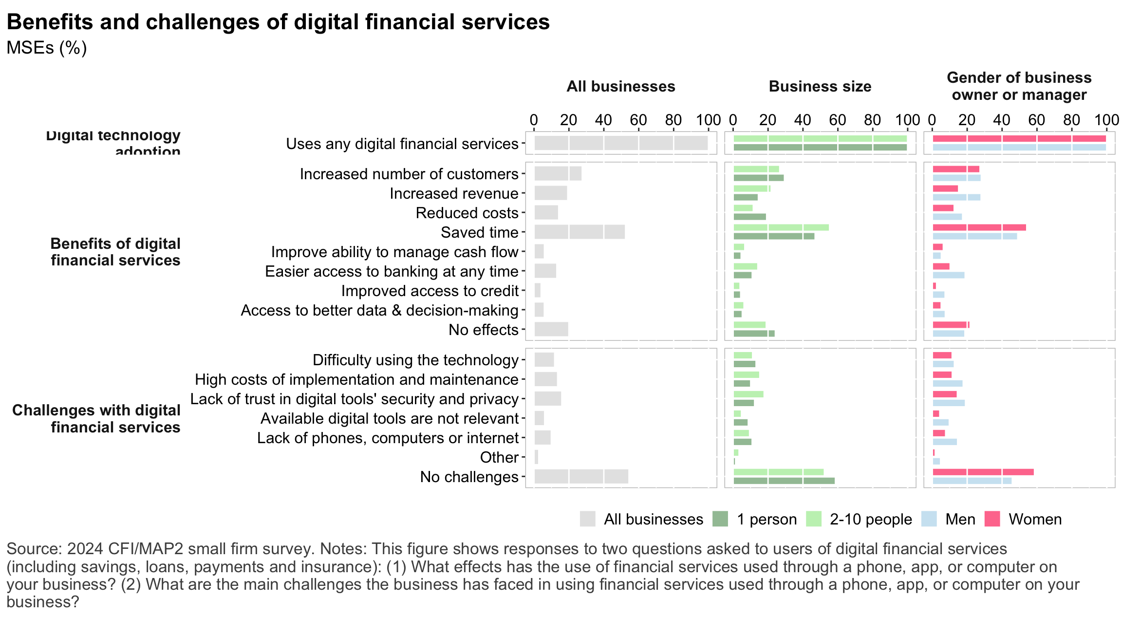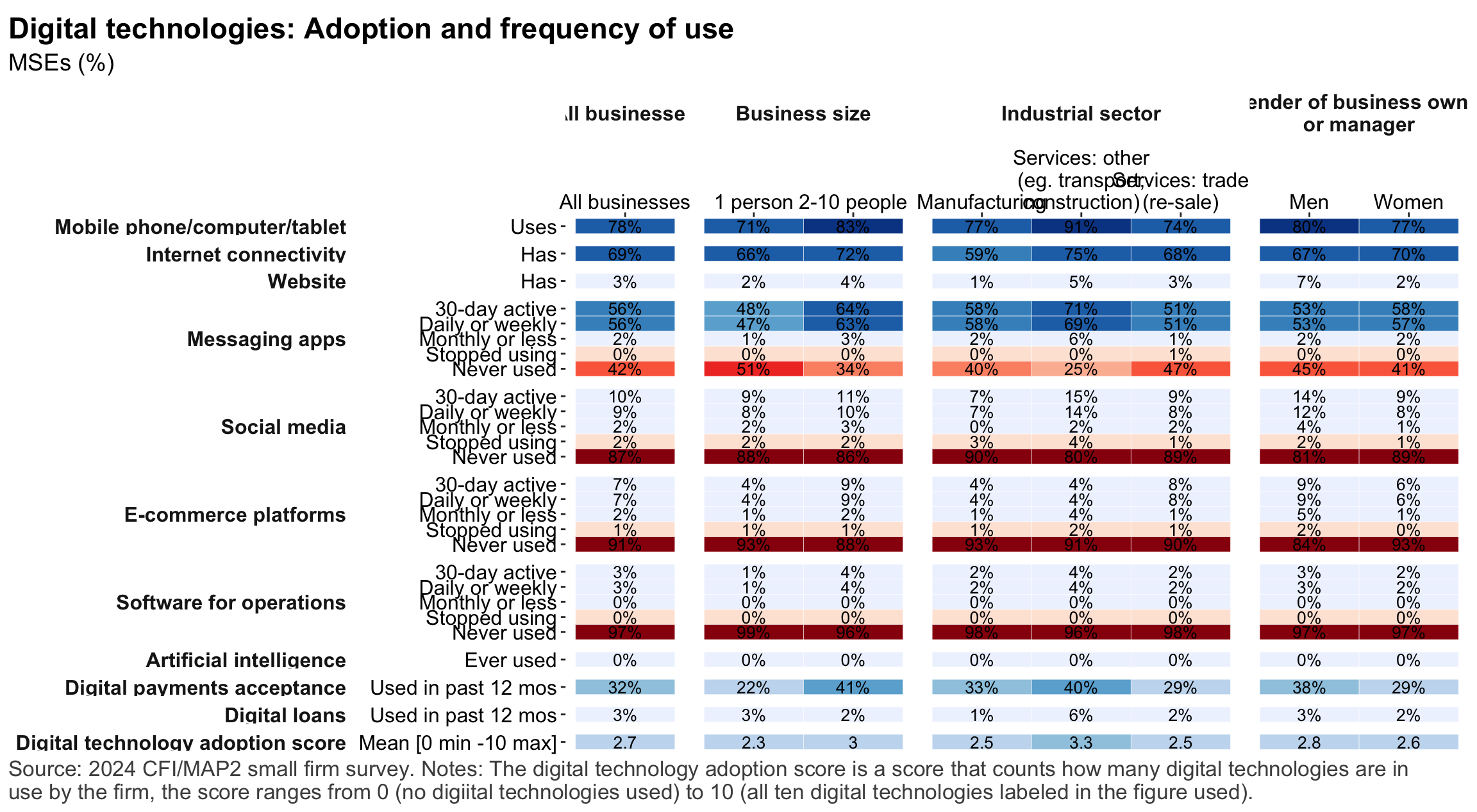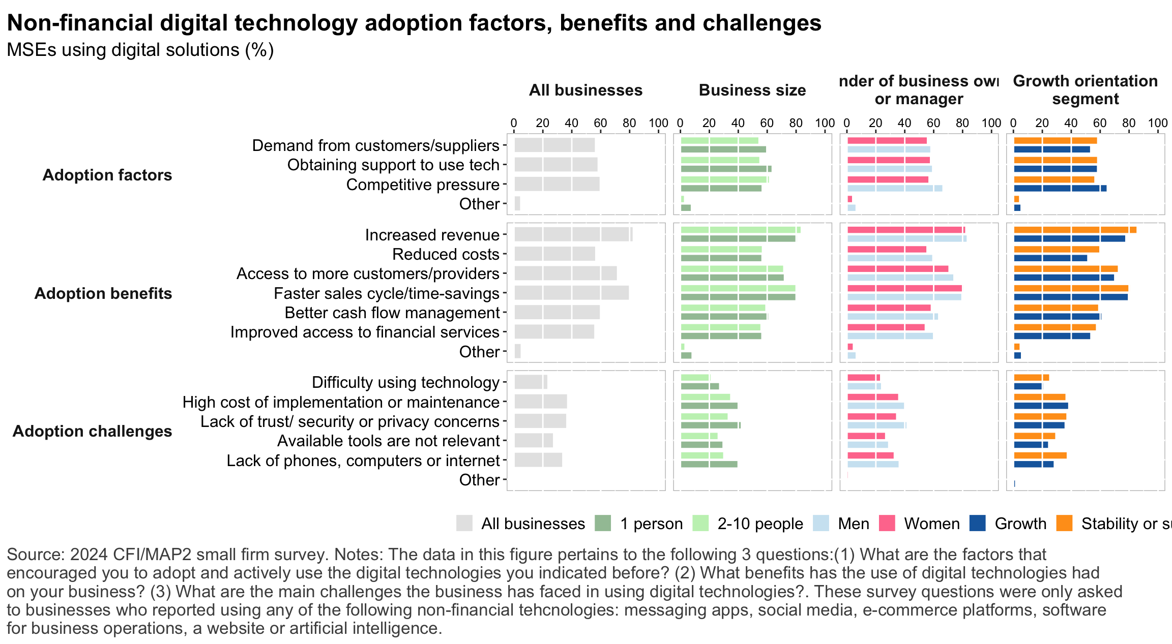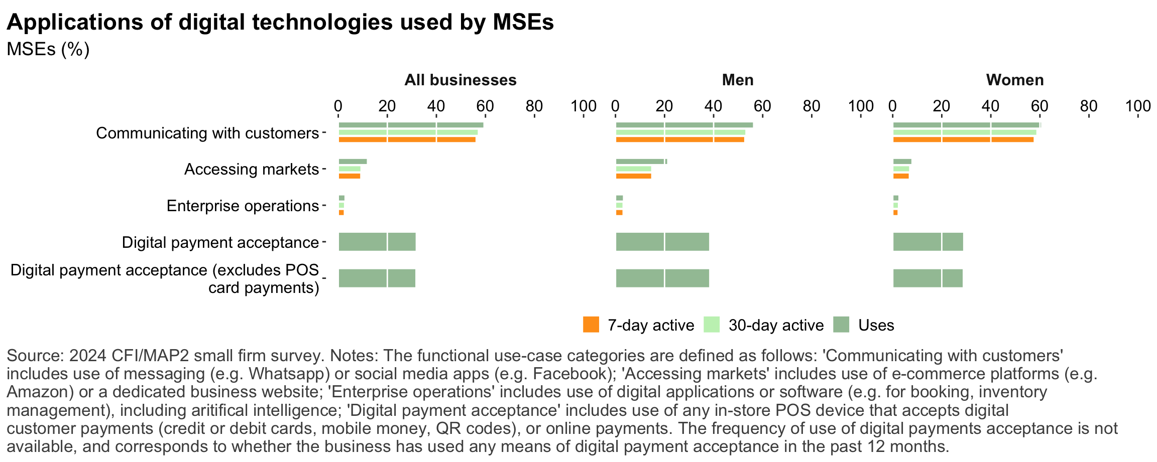 Figure 1: Geographic distribution of enumerated blocksFigure 2: Estimated business population by size and sectorFigure 3: MSE sample characteristicsFigure 4: MSEs by sector of productionFigure 5: MSE revenues and productivityFigure 6: Changes in MSE outcomes in past yearFigure 7: Gender composition of MSEs by sise and sectorFigure 8: MSE owner characteristicsFigure 9: Pyschographic characrteristics of SME owners or managers, by genderFigure 10: Correlation between owner’s motivations, goals and attitudes to riskFigure 11: Correlation between owner’s motivations, goals and attitudes to riskFigure 12: Relationship between owner’s gender and motivations, goals and attitudes to riskFigure 13: MSEs and codependence with owner’s householdFigure 14: Access to connectivity and devicesFigure 15: Predictors of digital technology adoptionFigure 16: Digital technology adoption by use caseFigure 17: Depth of digital technology adoptionFigure 18: Digital technology adoption factorsFigure 19: Relationship between internet-connectivity and firm-level labor productivityFigure 20: Relationship between digital technology and firm-level labor productivityFigure 21: Relationship between digital technology adoption and firm-level labor productivityFigure 22: Relationship between breadth of digital technology adoption and firm-level labor productivityFigure 23: Relationship between digital technology and financial resilienceFigure 24: Relationship between digital technology adoption and financial resilienceFigure 25: Financical accounts and savingsFigure 26: Merchant paymentsFigure 27: Demand for creditFigure 28: Barriers to creditFigure 29: Impacts of digital financial servicesFigure 30: Insurance usageFigure 31: Relationship between financial services and firm-level labor productivityFigure 32: Relationship between financial services and financial resilienceFigure 33: Challenges with loan repaymentFigure 34: Consumer protection issuesFigure 35: Risks: GeneralFigure 36: Risks: ClimateFigure 37: Risks: ImpactsFigure 38: Financial resilienceFigure 39: Other dimensions of business resilienceFigure 40: Resilience capital