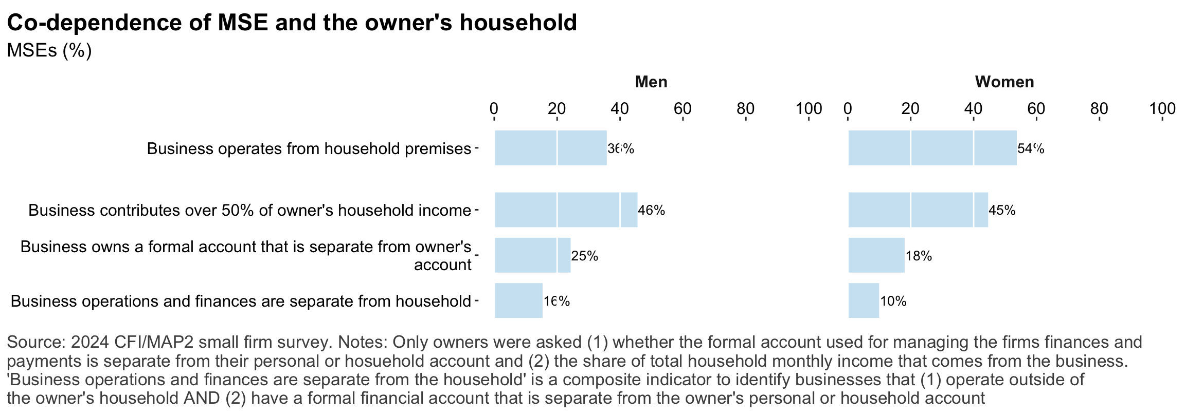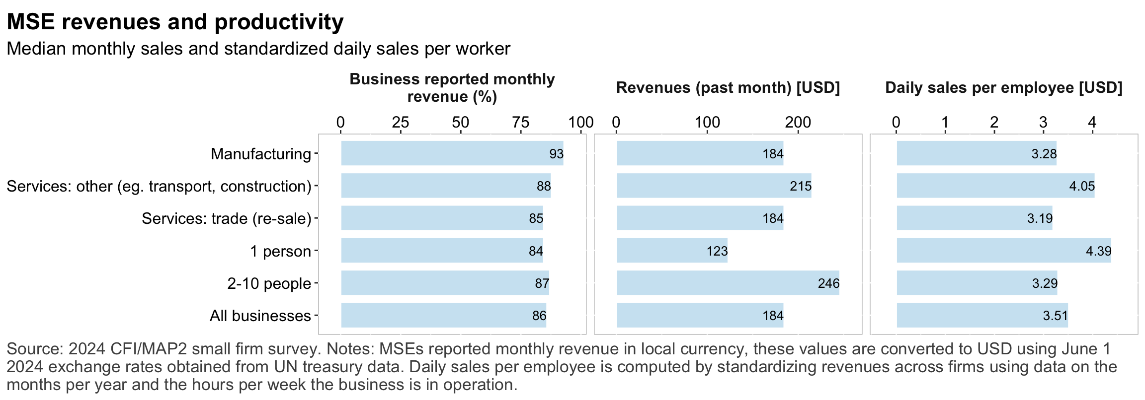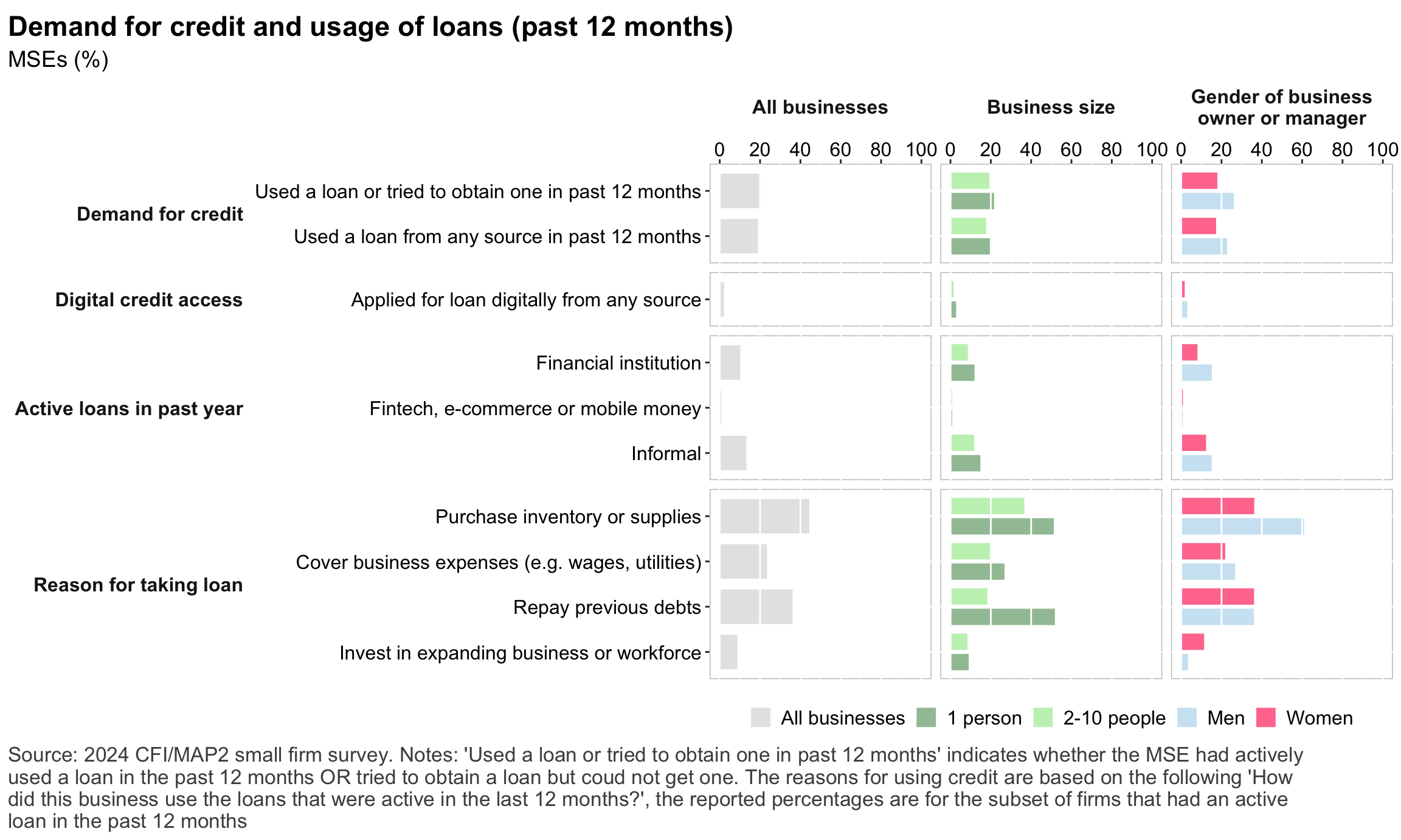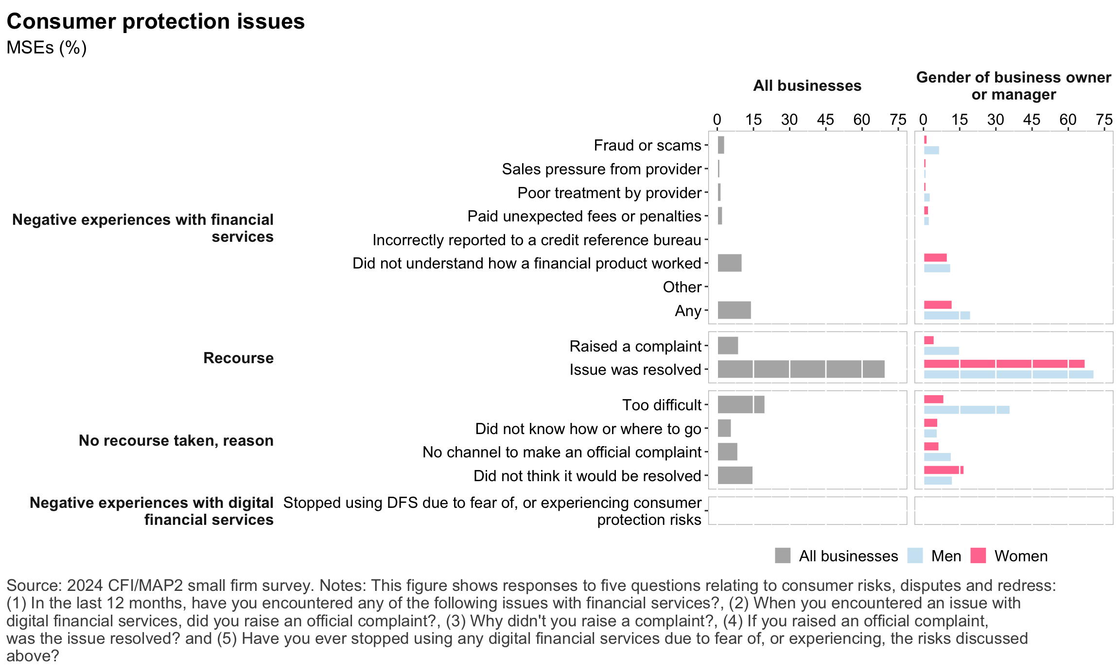 Figure 1: Geographic distribution of enumerated blocksFigure 2: Estimated business population by size and sectorFigure 3: MSE sample characteristicsFigure 4: MSEs by sector of productionFigure 5: MSE revenues and productivityFigure 6: Changes in MSE outcomes in past yearFigure 7: Gender composition of MSEs by sise and sectorFigure 8: MSE owner characteristicsFigure 9: Pyschographic characrteristics of SME owners or managers, by genderFigure 10: Correlation between owner’s motivations, goals and attitudes to riskFigure 11: Correlation between owner’s motivations, goals and attitudes to riskFigure 12: Relationship between owner’s gender and motivations, goals and attitudes to riskFigure 13: MSEs and codependence with owner’s householdFigure 14: Access to connectivity and devicesFigure 15: Predictors of digital technology adoptionFigure 16: Digital technology adoption by use caseFigure 17: Depth of digital technology adoptionFigure 18: Digital technology adoption factorsFigure 19: Relationship between internet-connectivity and firm-level labor productivityFigure 20: Relationship between digital technology and firm-level labor productivityFigure 21: Relationship between digital technology adoption and firm-level labor productivityFigure 22: Relationship between breadth of digital technology adoption and firm-level labor productivityFigure 23: Relationship between digital technology and financial resilienceFigure 24: Relationship between digital technology adoption and financial resilienceFigure 25: Financical accounts and savingsFigure 26: Merchant paymentsFigure 27: Demand for creditFigure 28: Barriers to creditFigure 29: Impacts of digital financial servicesFigure 30: Insurance usageFigure 31: Relationship between financial services and firm-level labor productivityFigure 32: Relationship between financial services and financial resilienceFigure 33: Challenges with loan repaymentFigure 34: Consumer protection issuesFigure 35: Risks: GeneralFigure 36: Risks: ClimateFigure 37: Risks: ImpactsFigure 38: Financial resilienceFigure 39: Other dimensions of business resilienceFigure 40: Resilience capital