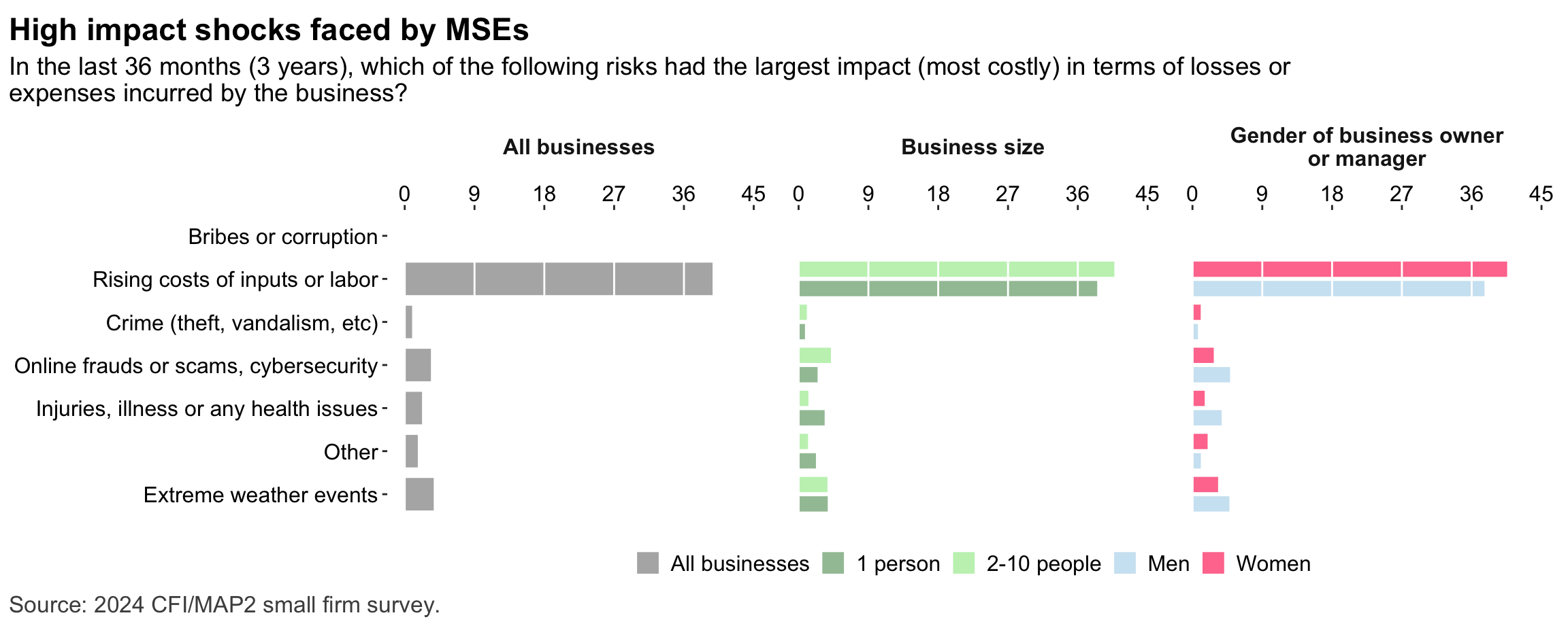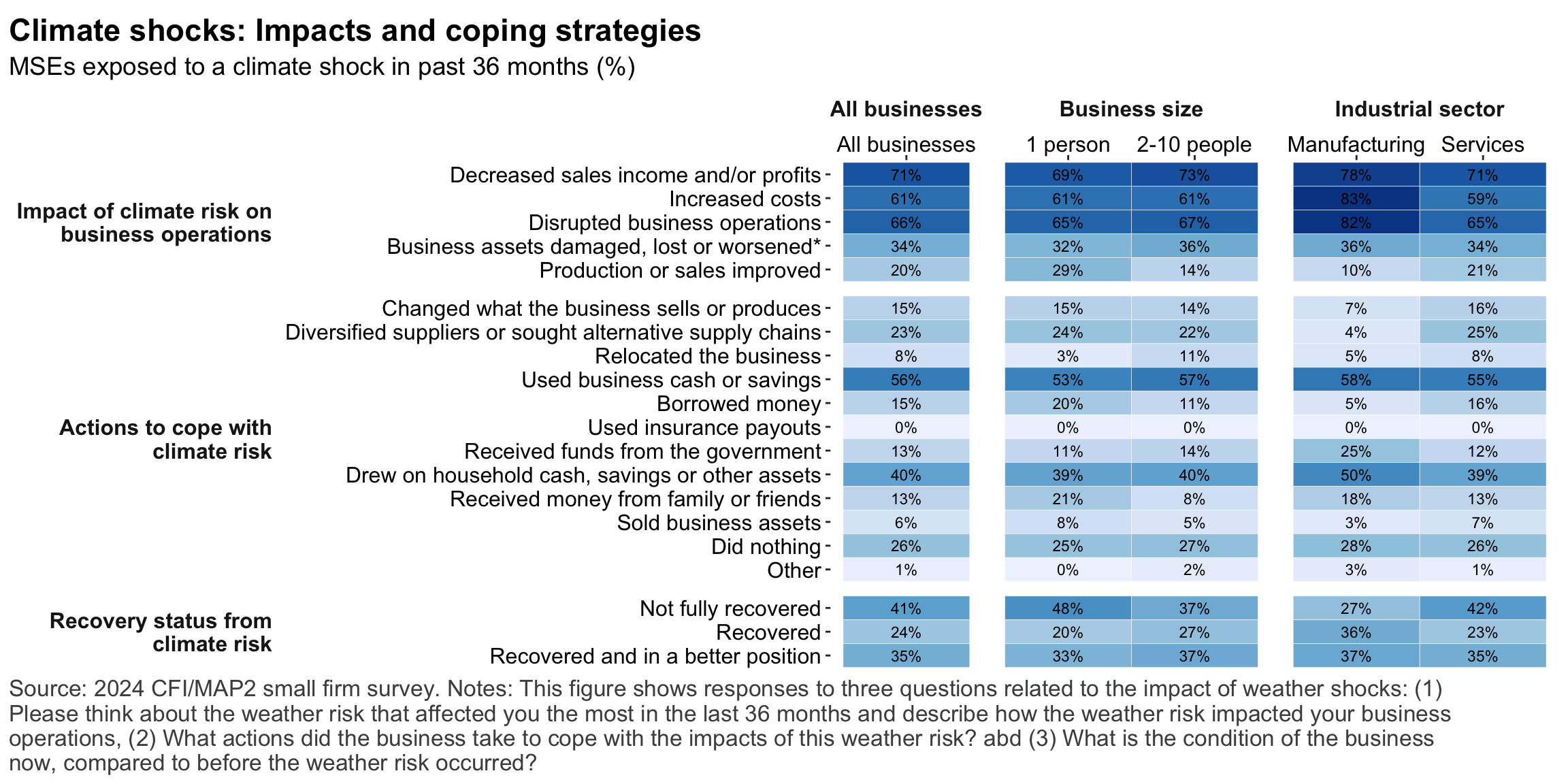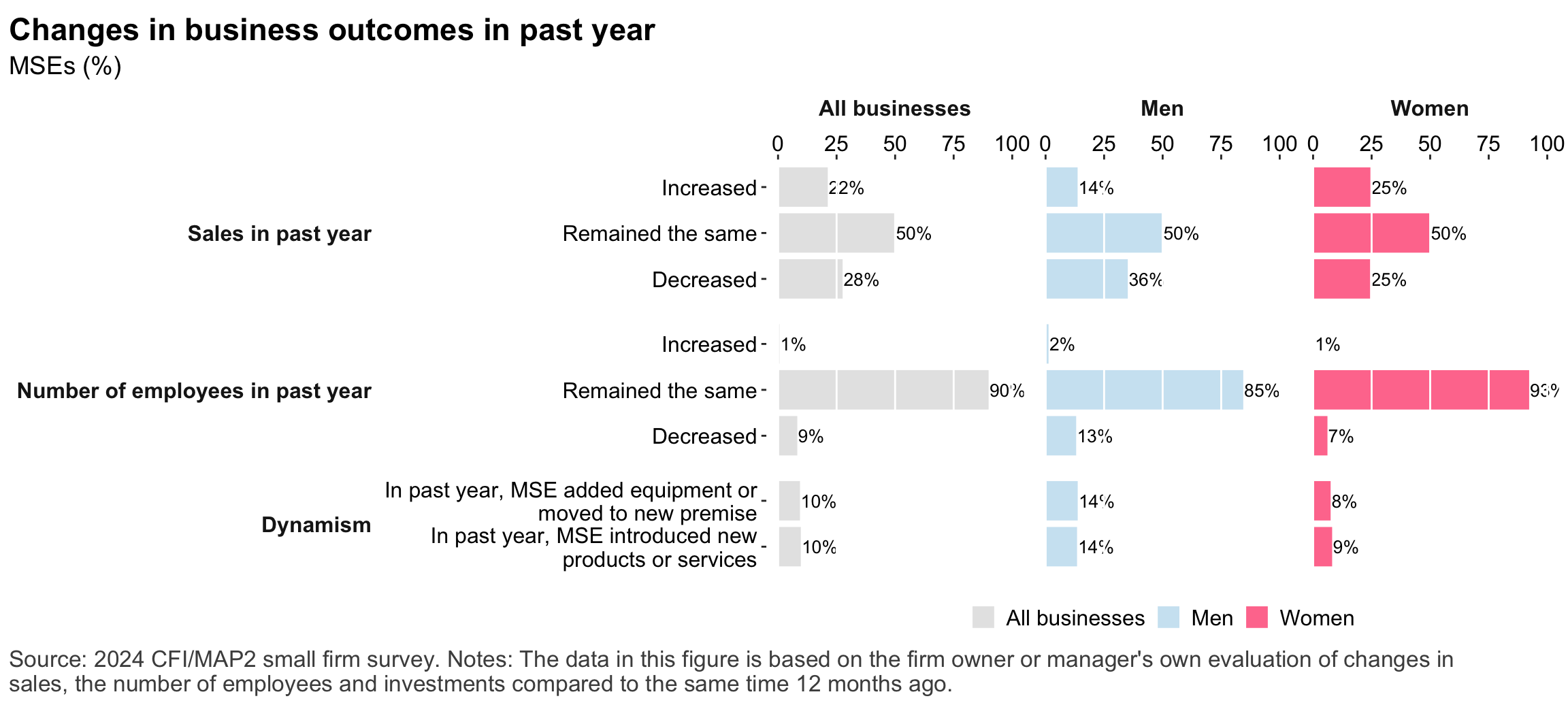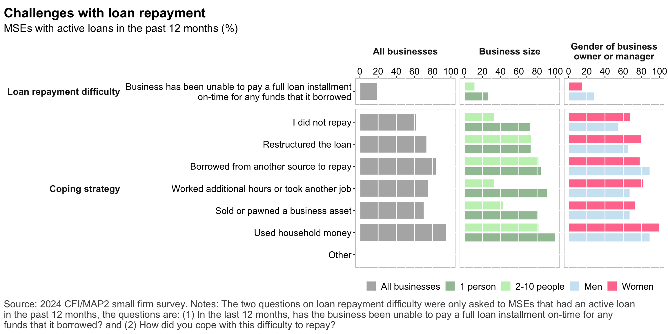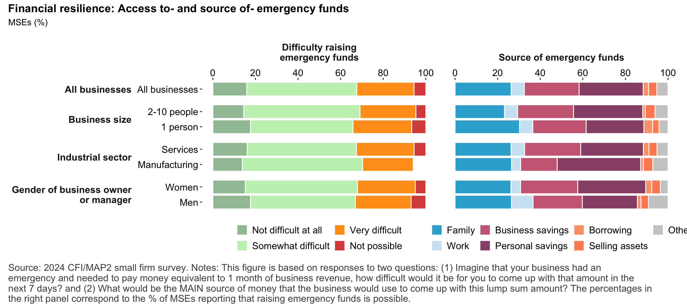 Figure 1: Geographic distribution of enumerated blocksFigure 2: Estimated business population by size and sectorFigure 3: MSE sample characteristicsFigure 4: MSEs by sector of productionFigure 5: MSE revenues and productivityFigure 6: Changes in MSE outcomes in past yearFigure 7: Gender composition of MSEs by sise and sectorFigure 8: MSE owner characteristicsFigure 9: Pyschographic characrteristics of SME owners or managers, by genderFigure 10: Correlation between owner’s motivations, goals and attitudes to riskFigure 11: Correlation between owner’s motivations, goals and attitudes to riskFigure 12: Relationship between owner’s gender and motivations, goals and attitudes to riskFigure 13: MSEs and codependence with owner’s householdFigure 14: Access to connectivity and devicesFigure 15: Predictors of digital technology adoptionFigure 16: Digital technology adoption by use caseFigure 17: Depth of digital technology adoptionFigure 18: Digital technology adoption factorsFigure 19: Relationship between internet-connectivity and firm-level labor productivityFigure 20: Relationship between digital technology and firm-level labor productivityFigure 21: Relationship between digital technology adoption and firm-level labor productivityFigure 22: Relationship between breadth of digital technology adoption and firm-level labor productivityFigure 23: Relationship between digital technology and financial resilienceFigure 24: Relationship between digital technology adoption and financial resilienceFigure 25: Financical accounts and savingsFigure 26: Merchant paymentsFigure 27: Demand for creditFigure 28: Barriers to creditFigure 29: Impacts of digital financial servicesFigure 30: Insurance usageFigure 31: Relationship between financial services and firm-level labor productivityFigure 32: Relationship between financial services and financial resilienceFigure 33: Challenges with loan repaymentFigure 34: Consumer protection issuesFigure 35: Risks: GeneralFigure 36: Risks: ClimateFigure 37: Risks: ImpactsFigure 38: Financial resilienceFigure 39: Other dimensions of business resilienceFigure 40: Resilience capital