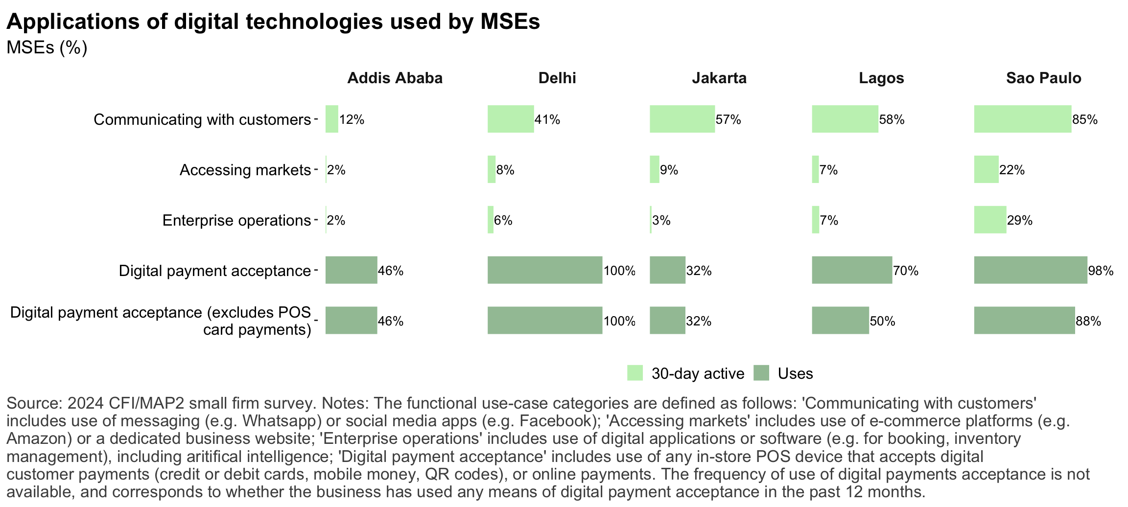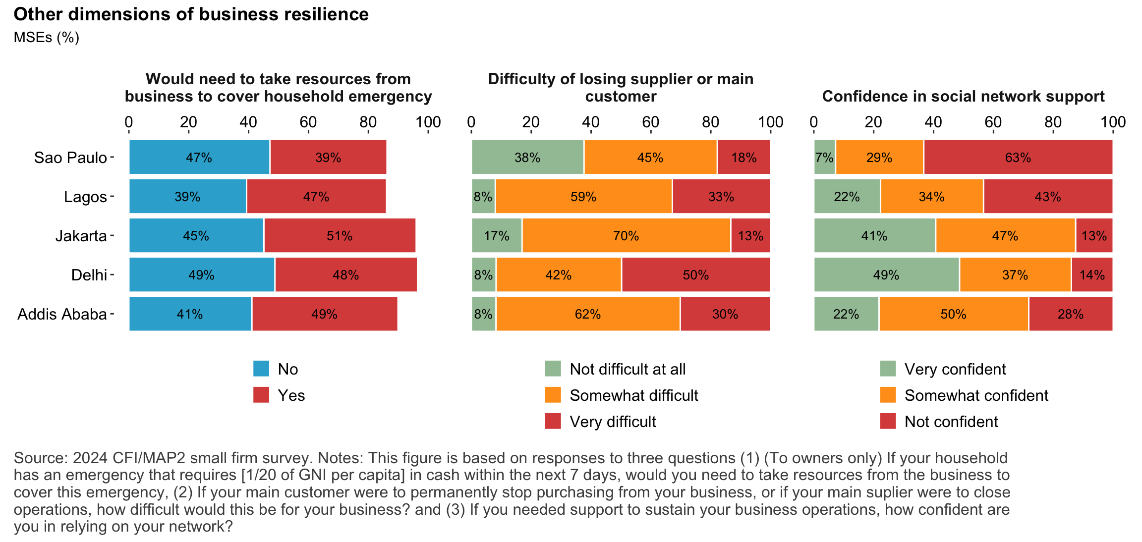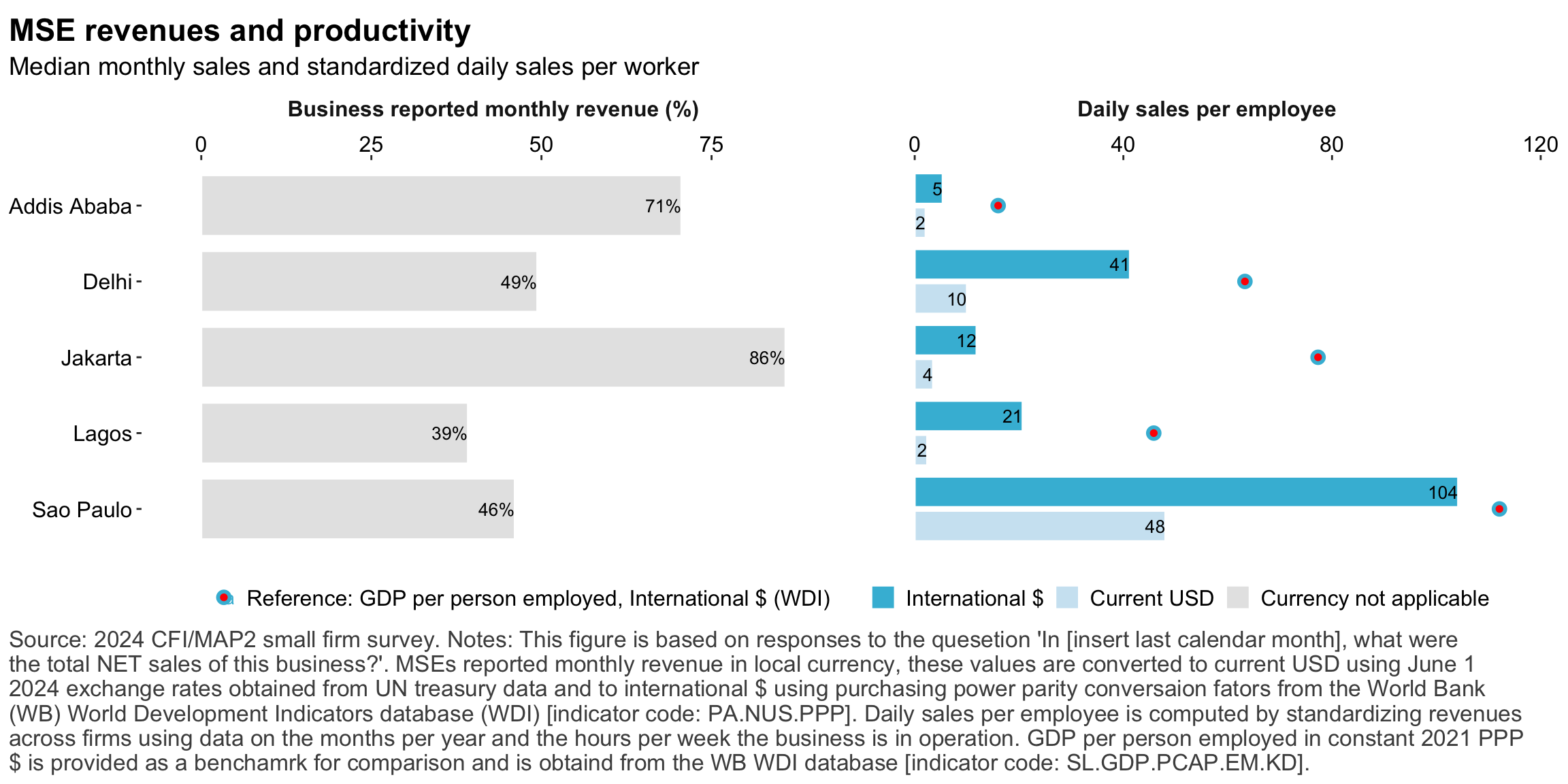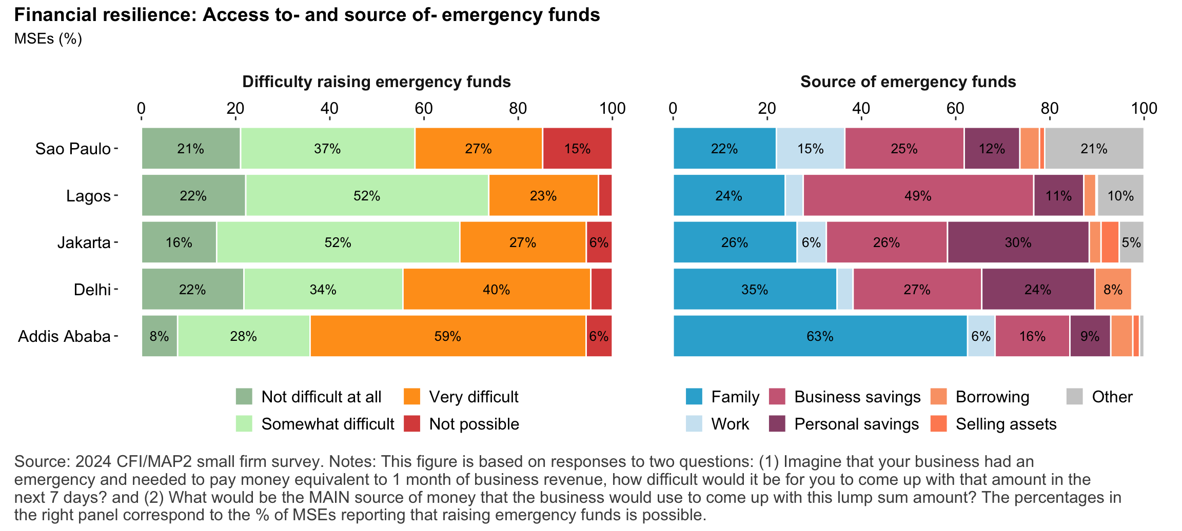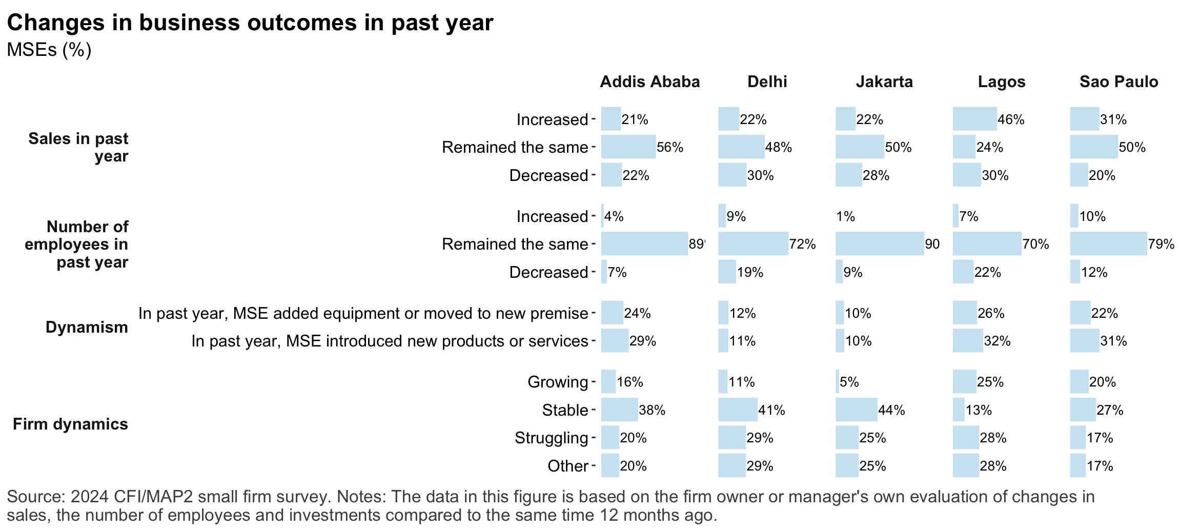 Figure 1: Businesses enumerated by sizeFigure 2: Businesses enumerated by sectorFigure 3: Businesses enumerated by sectorFigure 4: Sample characteristicsFigure 5: MSEs by sector of productionFigure 6: MSE revenues and productivityFigure 7: Changes in MSE outcomes in past yearFigure 8: MSE owner characteristicsFigure 9: Pyschographic characrteristics of SME owners or managers, by genderFigure 10: Pyschographic characrteristics of SME owners or managers, by genderFigure 11: Correlation between owner’s motivations, goals and attitudes to riskFigure 12: Summary measures of financial accessFigure 13: Access to connectivity and devicesFigure 14: Drivers of overall technology adoptionFigure 15: Applications of digital technologyFigure 16: Depth of digital technology adoptionFigure 17: Non-financial digital technology adoption factorsFigure 18: Relationship between internet-connectivity and firm-level labor productivityFigure 19: Relationship between digital technology and firm-level labor productivityFigure 20: Relationship between general digital technology adoption and subjective growthFigure 21: Relationship between digital technology adoption and firm-level labor productivityFigure 22: Relationship between digital technology adoption and firm-level labor productivityFigure 23: Relationship between depth of digital technology adoption and firm-level labor productivityFigure 24: Summary measures of financial accessFigure 25: Financical accounts and savingsFigure 26: Merchant paymentsFigure 27: Demand for creditFigure 28: Barriers to creditFigure 29: Impacts of digital financial servicesFigure 30: Insurance usageFigure 31: Relationship between financial services and firm-level labor productivityFigure 32: Relationship between financial services and financial resilienceFigure 33: Relationship between financial services and firm growthFigure 34: Relationship between financial services and capital investmentFigure 35: Challenges with loan repaymentFigure 36: Consumer protection issuesFigure 37: Consumer protection issuesFigure 38: Predictors of consumer protection risks: DemographicsFigure 39: Predictors of exposure to consumer risks: Breadth of digital technologiesFigure 40: Predictors of exposure to consumer risks: Non-financial digital technologiesFigure 41: Predictors of exposure to consumer risks: Financial servicesFigure 42: Relationship between depth of digital technology adoption and exposure to consumer protection risksFigure 43: Risks: GeneralFigure 44: Risks: ClimateFigure 45: Risks: ImpactsFigure 46: Financial resilienceFigure 47: Non-financial dimensions of business resilienceFigure 48: Access to connectivity and devicesFigure 49: Relationship between prior exposure to weather shock and investment in adaptationFigure 50: Relationship between prior exposure to weather shock and use of financial servicesFigure 51: Relationship between prior exposure to weather shock and use of digital toolsFigure 52: Relationship between overall technology adoption & resilienceFigure 53: MSEs by premises typeFigure 54: MSES by sector