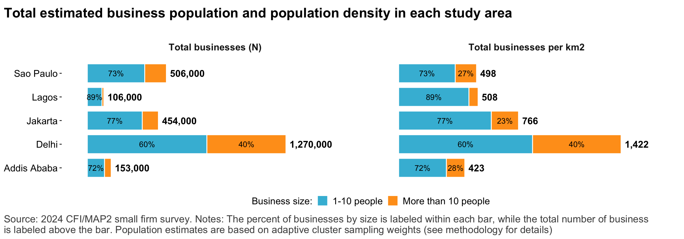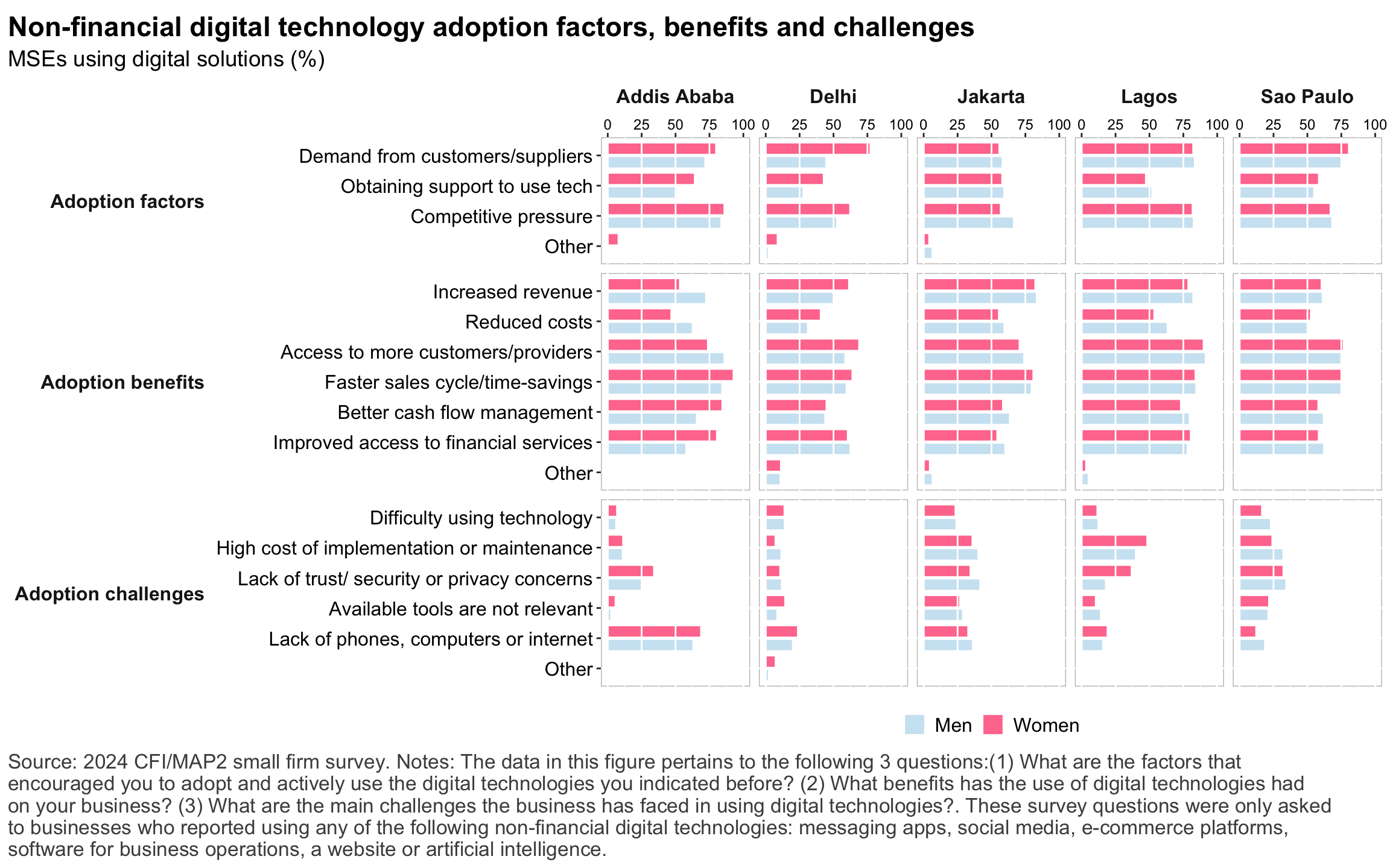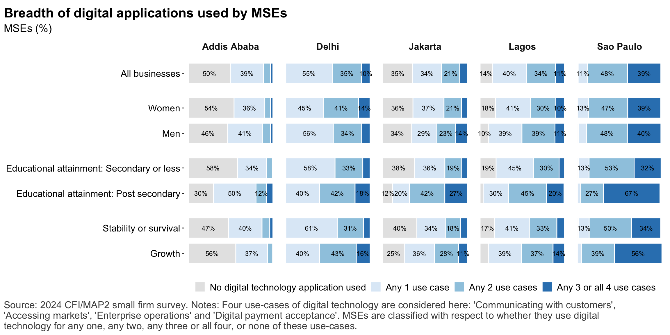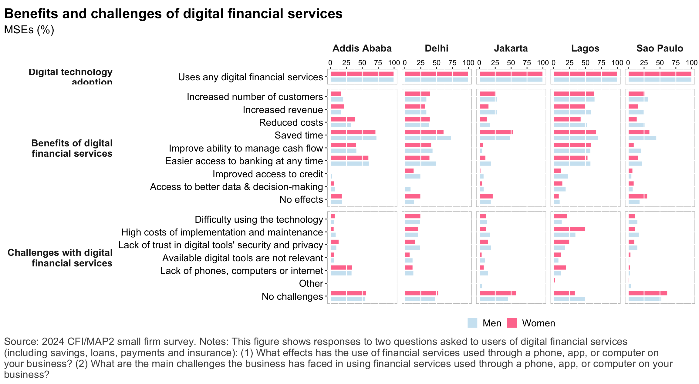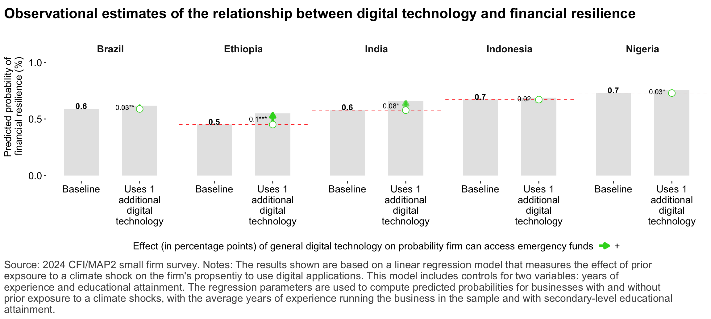 Figure 1: Businesses enumerated by sizeFigure 2: Businesses enumerated by sectorFigure 3: Businesses enumerated by sectorFigure 4: Sample characteristicsFigure 5: MSEs by sector of productionFigure 6: MSE revenues and productivityFigure 7: Changes in MSE outcomes in past yearFigure 8: MSE owner characteristicsFigure 9: Pyschographic characrteristics of SME owners or managers, by genderFigure 10: Pyschographic characrteristics of SME owners or managers, by genderFigure 11: Correlation between owner’s motivations, goals and attitudes to riskFigure 12: Summary measures of financial accessFigure 13: Access to connectivity and devicesFigure 14: Drivers of overall technology adoptionFigure 15: Applications of digital technologyFigure 16: Depth of digital technology adoptionFigure 17: Non-financial digital technology adoption factorsFigure 18: Relationship between internet-connectivity and firm-level labor productivityFigure 19: Relationship between digital technology and firm-level labor productivityFigure 20: Relationship between general digital technology adoption and subjective growthFigure 21: Relationship between digital technology adoption and firm-level labor productivityFigure 22: Relationship between digital technology adoption and firm-level labor productivityFigure 23: Relationship between depth of digital technology adoption and firm-level labor productivityFigure 24: Summary measures of financial accessFigure 25: Financical accounts and savingsFigure 26: Merchant paymentsFigure 27: Demand for creditFigure 28: Barriers to creditFigure 29: Impacts of digital financial servicesFigure 30: Insurance usageFigure 31: Relationship between financial services and firm-level labor productivityFigure 32: Relationship between financial services and financial resilienceFigure 33: Relationship between financial services and firm growthFigure 34: Relationship between financial services and capital investmentFigure 35: Challenges with loan repaymentFigure 36: Consumer protection issuesFigure 37: Consumer protection issuesFigure 38: Predictors of consumer protection risks: DemographicsFigure 39: Predictors of exposure to consumer risks: Breadth of digital technologiesFigure 40: Predictors of exposure to consumer risks: Non-financial digital technologiesFigure 41: Predictors of exposure to consumer risks: Financial servicesFigure 42: Relationship between depth of digital technology adoption and exposure to consumer protection risksFigure 43: Risks: GeneralFigure 44: Risks: ClimateFigure 45: Risks: ImpactsFigure 46: Financial resilienceFigure 47: Non-financial dimensions of business resilienceFigure 48: Access to connectivity and devicesFigure 49: Relationship between prior exposure to weather shock and investment in adaptationFigure 50: Relationship between prior exposure to weather shock and use of financial servicesFigure 51: Relationship between prior exposure to weather shock and use of digital toolsFigure 52: Relationship between overall technology adoption & resilienceFigure 53: MSEs by premises typeFigure 54: MSES by sector