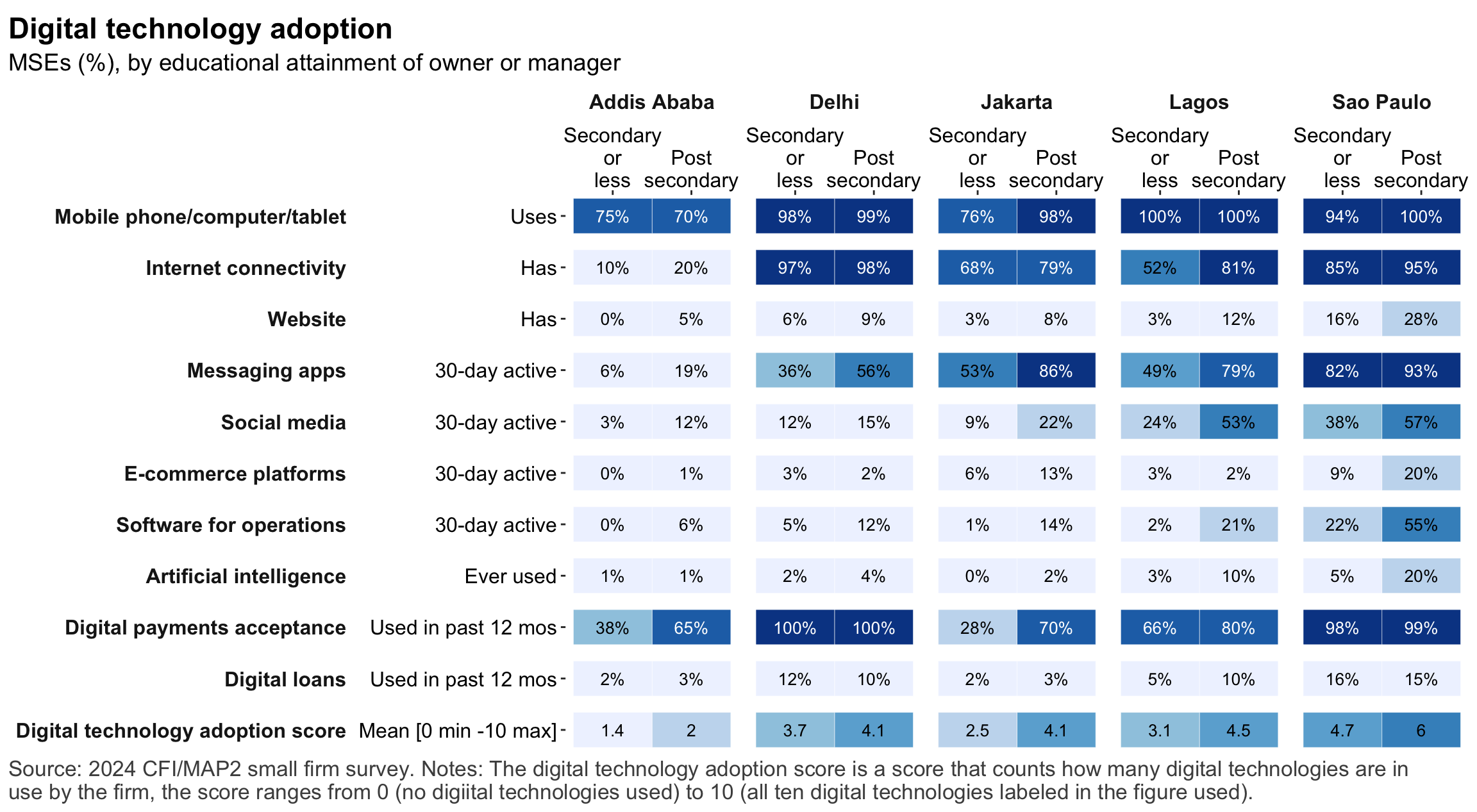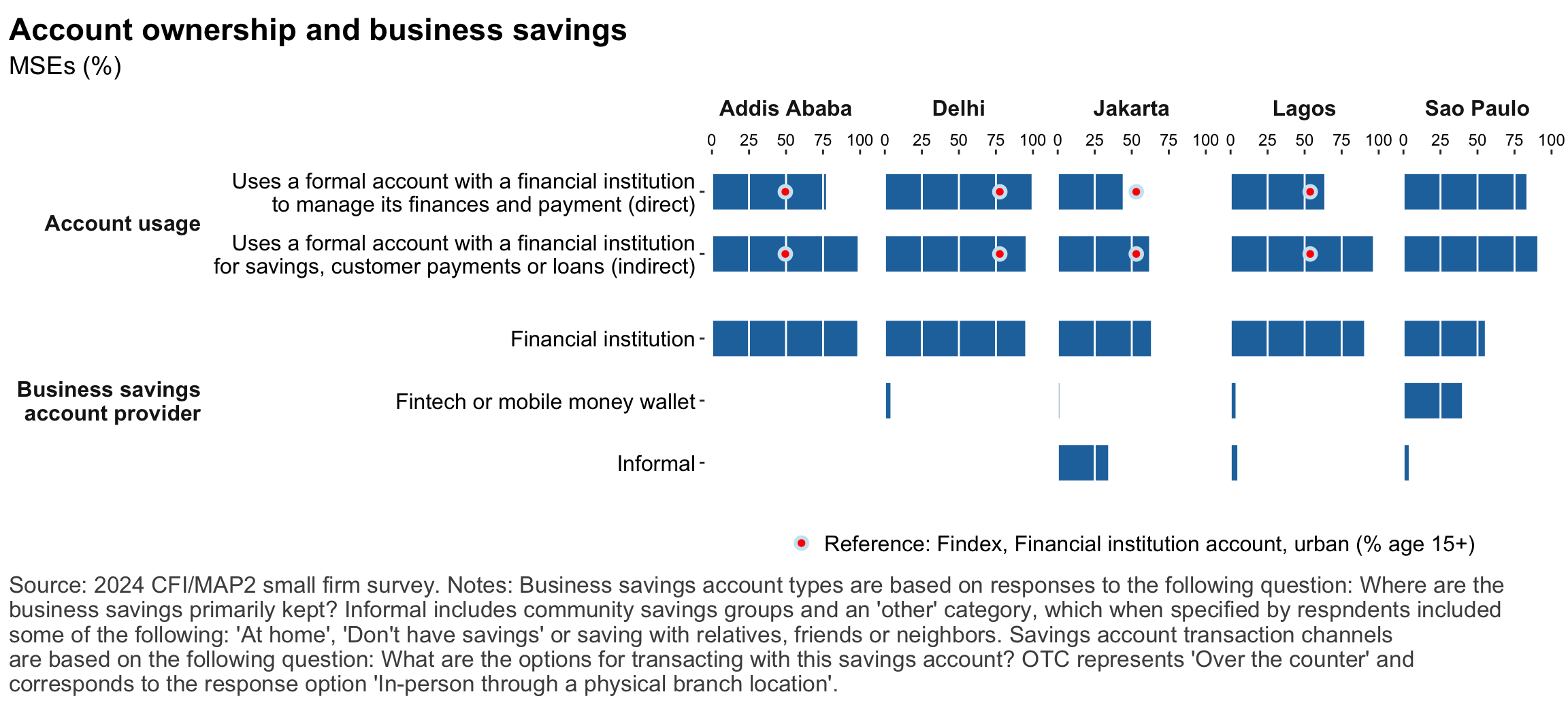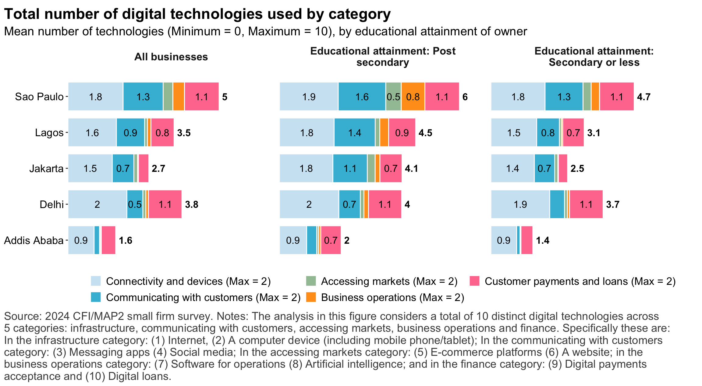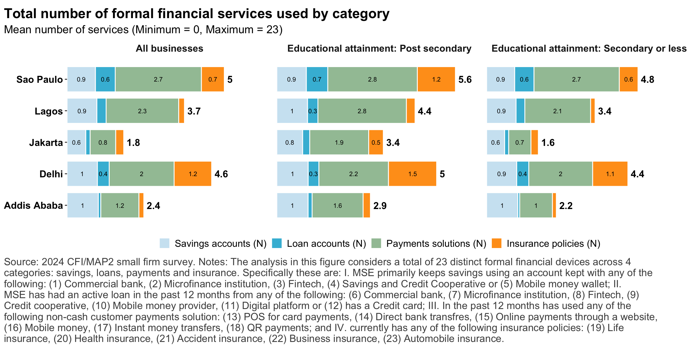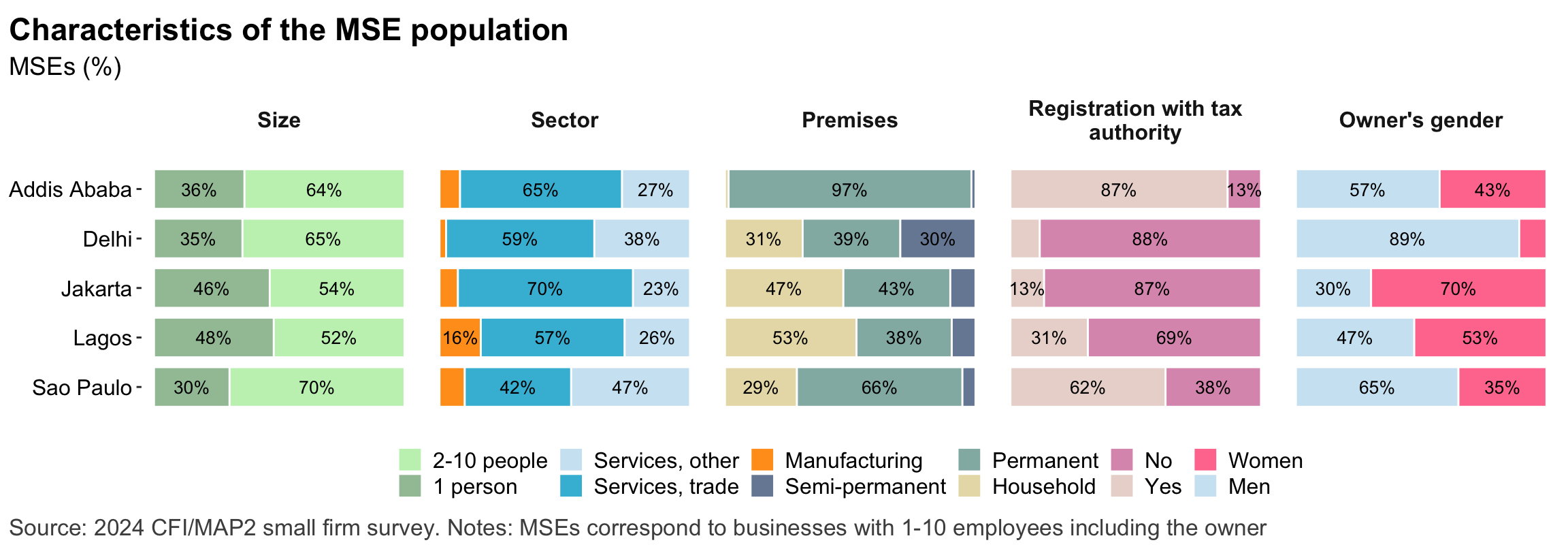 Figure 1: Businesses enumerated by sizeFigure 2: Businesses enumerated by sectorFigure 3: Businesses enumerated by sectorFigure 4: Sample characteristicsFigure 5: MSEs by sector of productionFigure 6: MSE revenues and productivityFigure 7: Changes in MSE outcomes in past yearFigure 8: MSE owner characteristicsFigure 9: Pyschographic characrteristics of SME owners or managers, by genderFigure 10: Pyschographic characrteristics of SME owners or managers, by genderFigure 11: Correlation between owner’s motivations, goals and attitudes to riskFigure 12: Summary measures of financial accessFigure 13: Access to connectivity and devicesFigure 14: Drivers of overall technology adoptionFigure 15: Applications of digital technologyFigure 16: Depth of digital technology adoptionFigure 17: Non-financial digital technology adoption factorsFigure 18: Relationship between internet-connectivity and firm-level labor productivityFigure 19: Relationship between digital technology and firm-level labor productivityFigure 20: Relationship between general digital technology adoption and subjective growthFigure 21: Relationship between digital technology adoption and firm-level labor productivityFigure 22: Relationship between digital technology adoption and firm-level labor productivityFigure 23: Relationship between depth of digital technology adoption and firm-level labor productivityFigure 24: Summary measures of financial accessFigure 25: Financical accounts and savingsFigure 26: Merchant paymentsFigure 27: Demand for creditFigure 28: Barriers to creditFigure 29: Impacts of digital financial servicesFigure 30: Insurance usageFigure 31: Relationship between financial services and firm-level labor productivityFigure 32: Relationship between financial services and financial resilienceFigure 33: Relationship between financial services and firm growthFigure 34: Relationship between financial services and capital investmentFigure 35: Challenges with loan repaymentFigure 36: Consumer protection issuesFigure 37: Consumer protection issuesFigure 38: Predictors of consumer protection risks: DemographicsFigure 39: Predictors of exposure to consumer risks: Breadth of digital technologiesFigure 40: Predictors of exposure to consumer risks: Non-financial digital technologiesFigure 41: Predictors of exposure to consumer risks: Financial servicesFigure 42: Relationship between depth of digital technology adoption and exposure to consumer protection risksFigure 43: Risks: GeneralFigure 44: Risks: ClimateFigure 45: Risks: ImpactsFigure 46: Financial resilienceFigure 47: Non-financial dimensions of business resilienceFigure 48: Access to connectivity and devicesFigure 49: Relationship between prior exposure to weather shock and investment in adaptationFigure 50: Relationship between prior exposure to weather shock and use of financial servicesFigure 51: Relationship between prior exposure to weather shock and use of digital toolsFigure 52: Relationship between overall technology adoption & resilienceFigure 53: MSEs by premises typeFigure 54: MSES by sector
