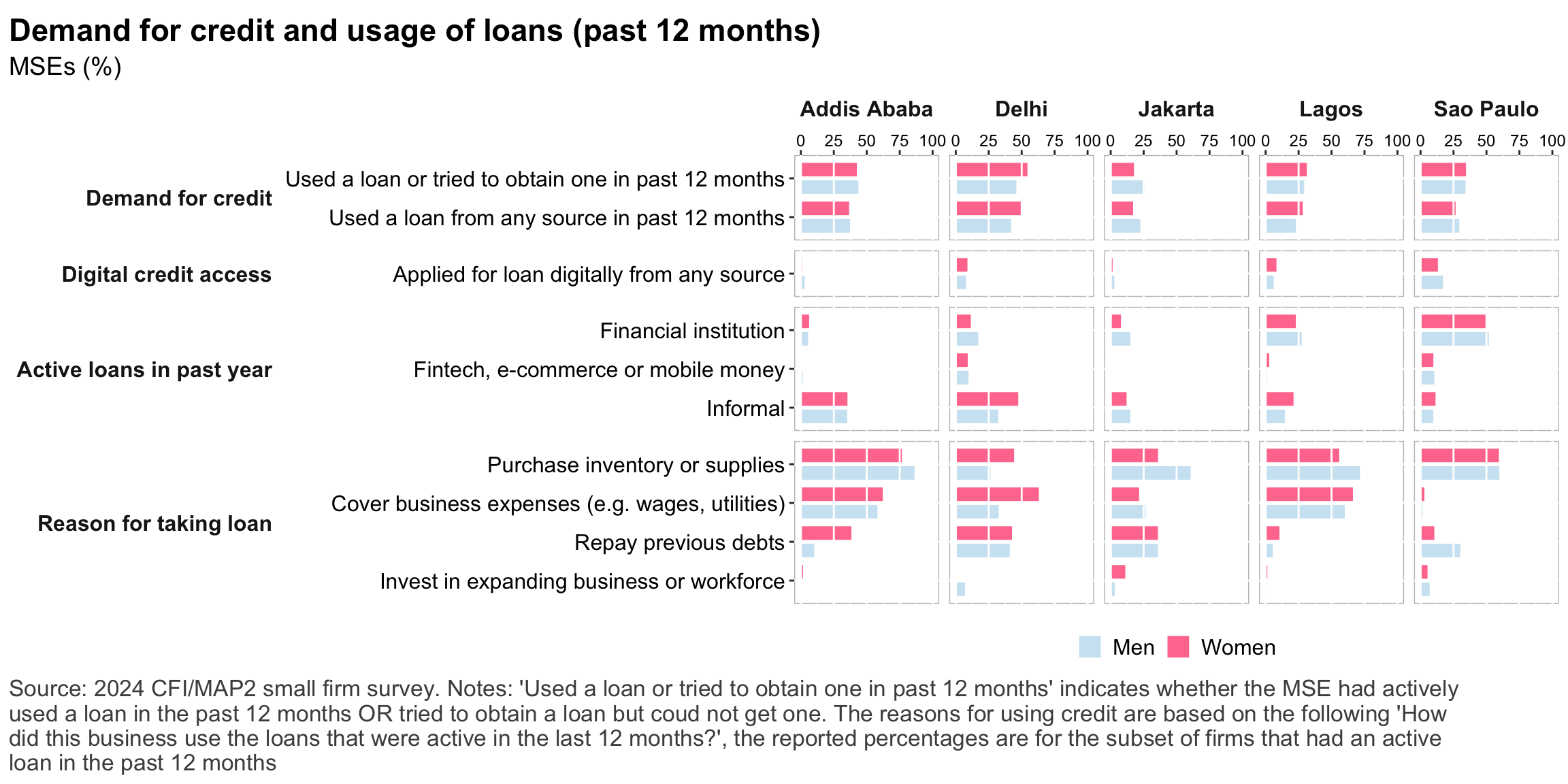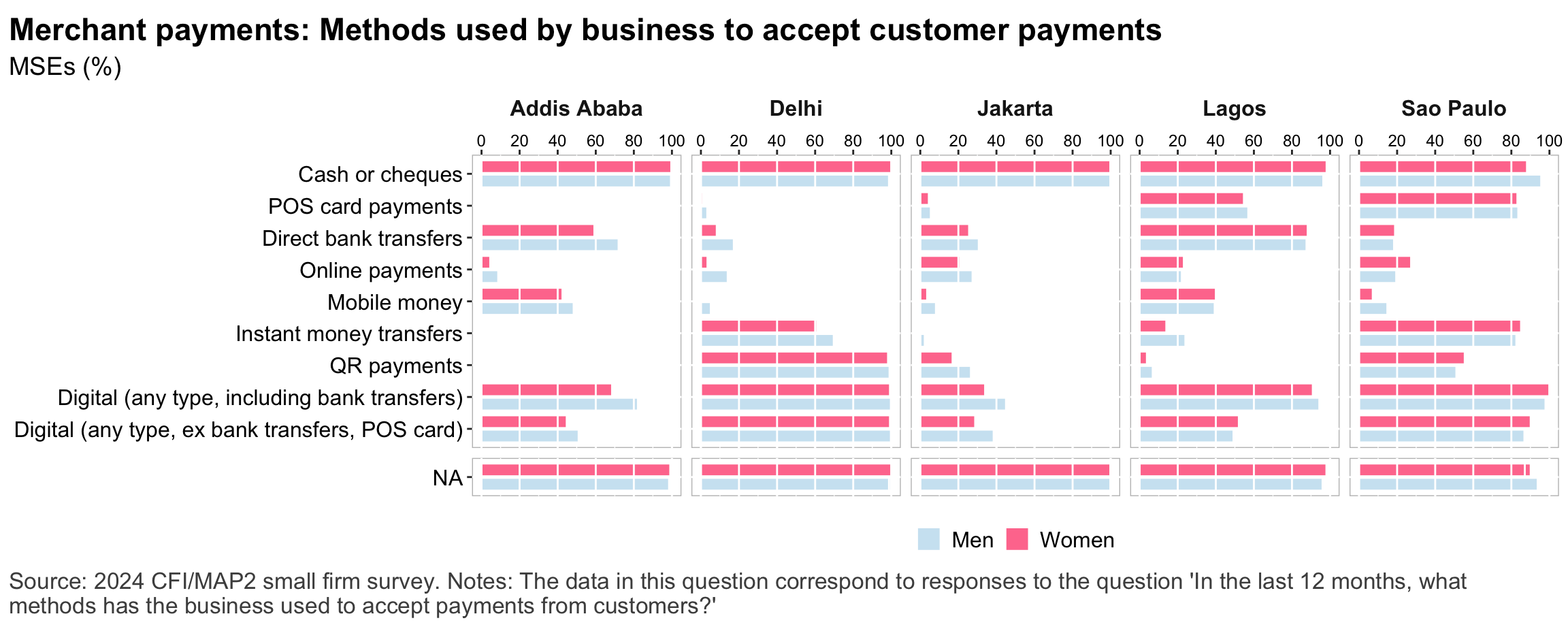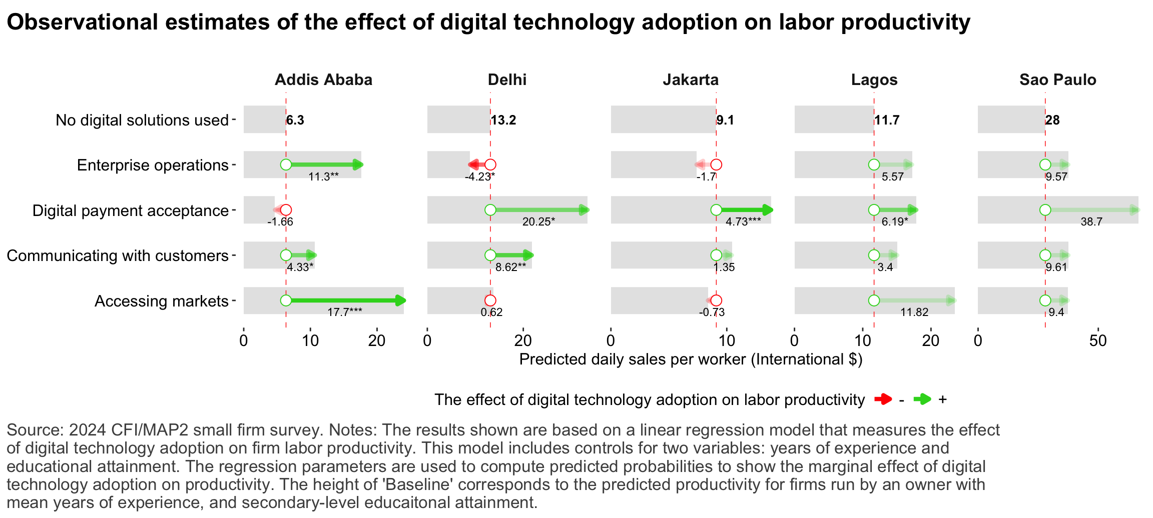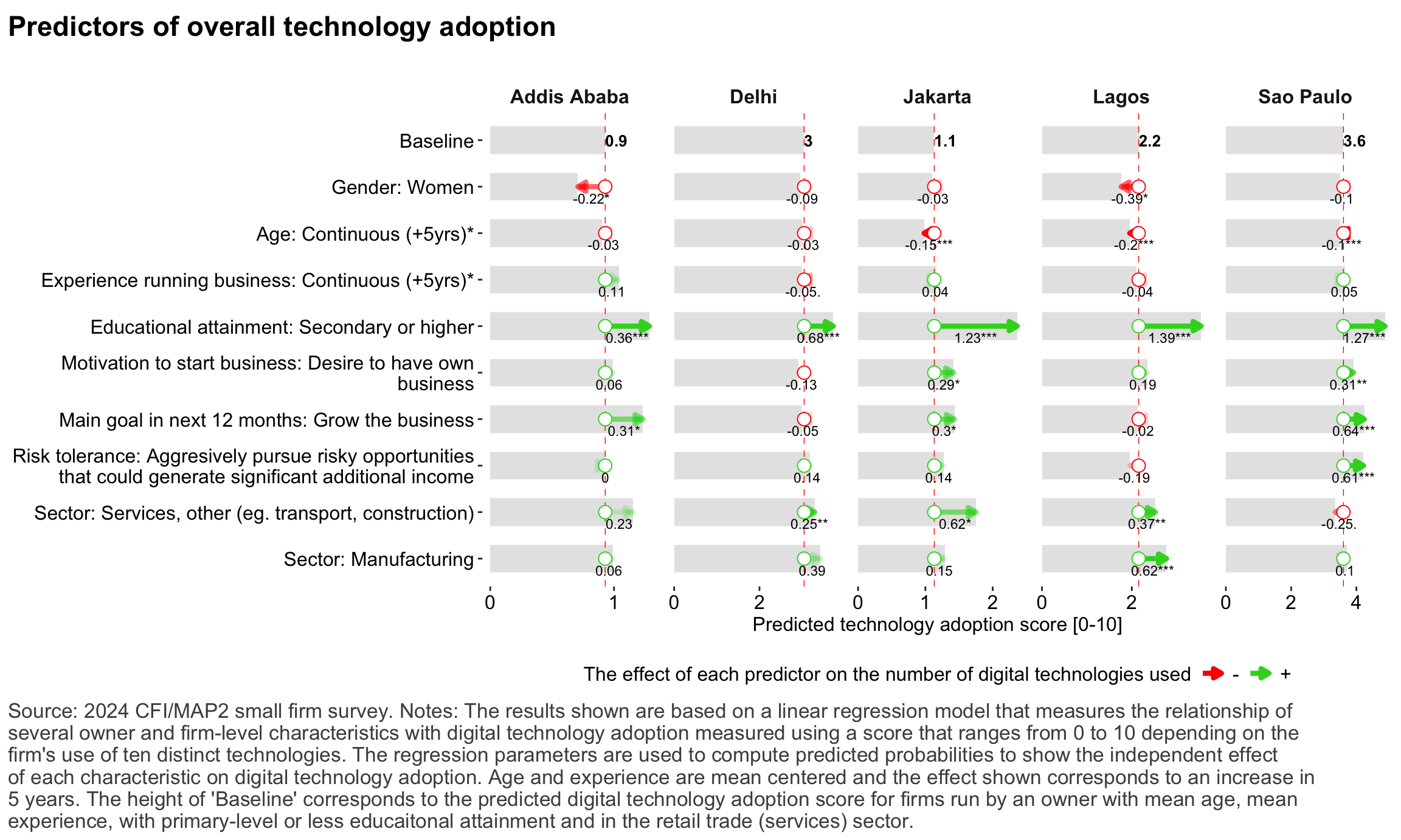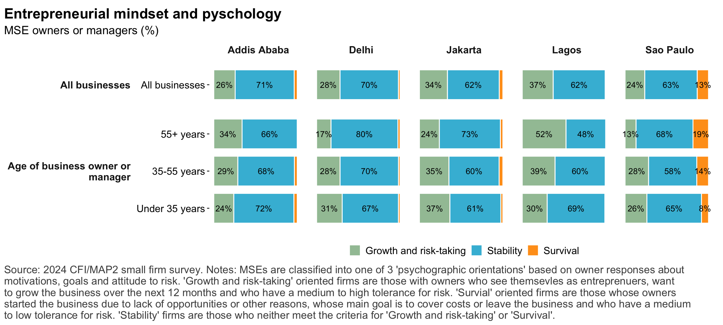 Figure 1: Businesses enumerated by sizeFigure 2: Businesses enumerated by sectorFigure 3: Businesses enumerated by sectorFigure 4: Sample characteristicsFigure 5: MSEs by sector of productionFigure 6: MSE revenues and productivityFigure 7: Changes in MSE outcomes in past yearFigure 8: MSE owner characteristicsFigure 9: Pyschographic characrteristics of SME owners or managers, by genderFigure 10: Pyschographic characrteristics of SME owners or managers, by genderFigure 11: Correlation between owner’s motivations, goals and attitudes to riskFigure 12: Summary measures of financial accessFigure 13: Access to connectivity and devicesFigure 14: Drivers of overall technology adoptionFigure 15: Applications of digital technologyFigure 16: Depth of digital technology adoptionFigure 17: Non-financial digital technology adoption factorsFigure 18: Relationship between internet-connectivity and firm-level labor productivityFigure 19: Relationship between digital technology and firm-level labor productivityFigure 20: Relationship between general digital technology adoption and subjective growthFigure 21: Relationship between digital technology adoption and firm-level labor productivityFigure 22: Relationship between digital technology adoption and firm-level labor productivityFigure 23: Relationship between depth of digital technology adoption and firm-level labor productivityFigure 24: Summary measures of financial accessFigure 25: Financical accounts and savingsFigure 26: Merchant paymentsFigure 27: Demand for creditFigure 28: Barriers to creditFigure 29: Impacts of digital financial servicesFigure 30: Insurance usageFigure 31: Relationship between financial services and firm-level labor productivityFigure 32: Relationship between financial services and financial resilienceFigure 33: Relationship between financial services and firm growthFigure 34: Relationship between financial services and capital investmentFigure 35: Challenges with loan repaymentFigure 36: Consumer protection issuesFigure 37: Consumer protection issuesFigure 38: Predictors of consumer protection risks: DemographicsFigure 39: Predictors of exposure to consumer risks: Breadth of digital technologiesFigure 40: Predictors of exposure to consumer risks: Non-financial digital technologiesFigure 41: Predictors of exposure to consumer risks: Financial servicesFigure 42: Relationship between depth of digital technology adoption and exposure to consumer protection risksFigure 43: Risks: GeneralFigure 44: Risks: ClimateFigure 45: Risks: ImpactsFigure 46: Financial resilienceFigure 47: Non-financial dimensions of business resilienceFigure 48: Access to connectivity and devicesFigure 49: Relationship between prior exposure to weather shock and investment in adaptationFigure 50: Relationship between prior exposure to weather shock and use of financial servicesFigure 51: Relationship between prior exposure to weather shock and use of digital toolsFigure 52: Relationship between overall technology adoption & resilienceFigure 53: MSEs by premises typeFigure 54: MSES by sector