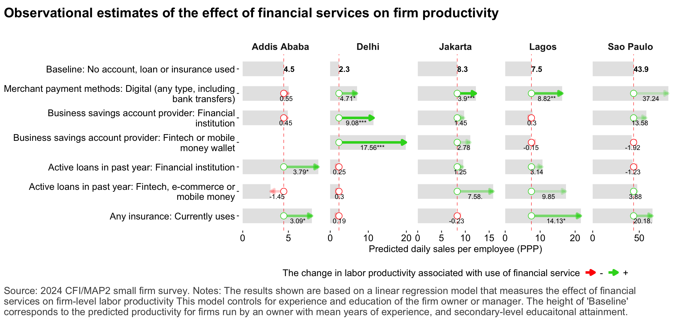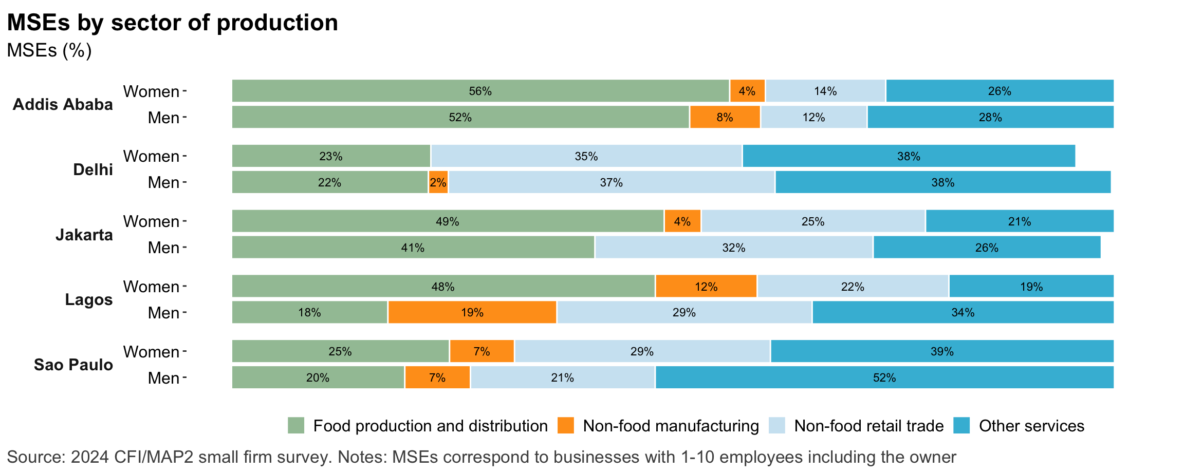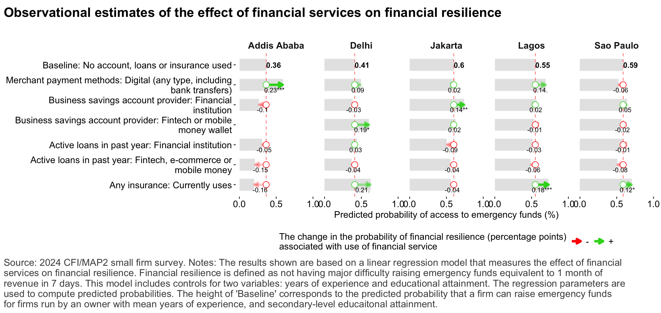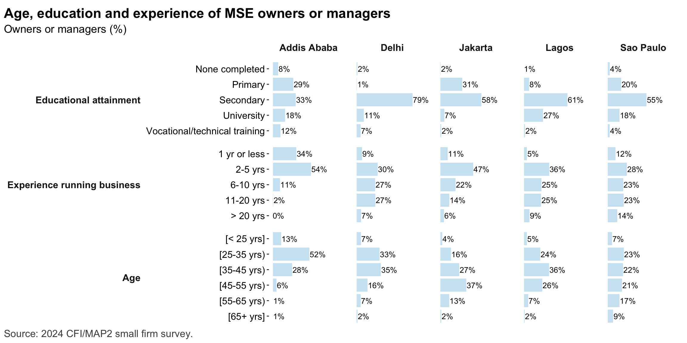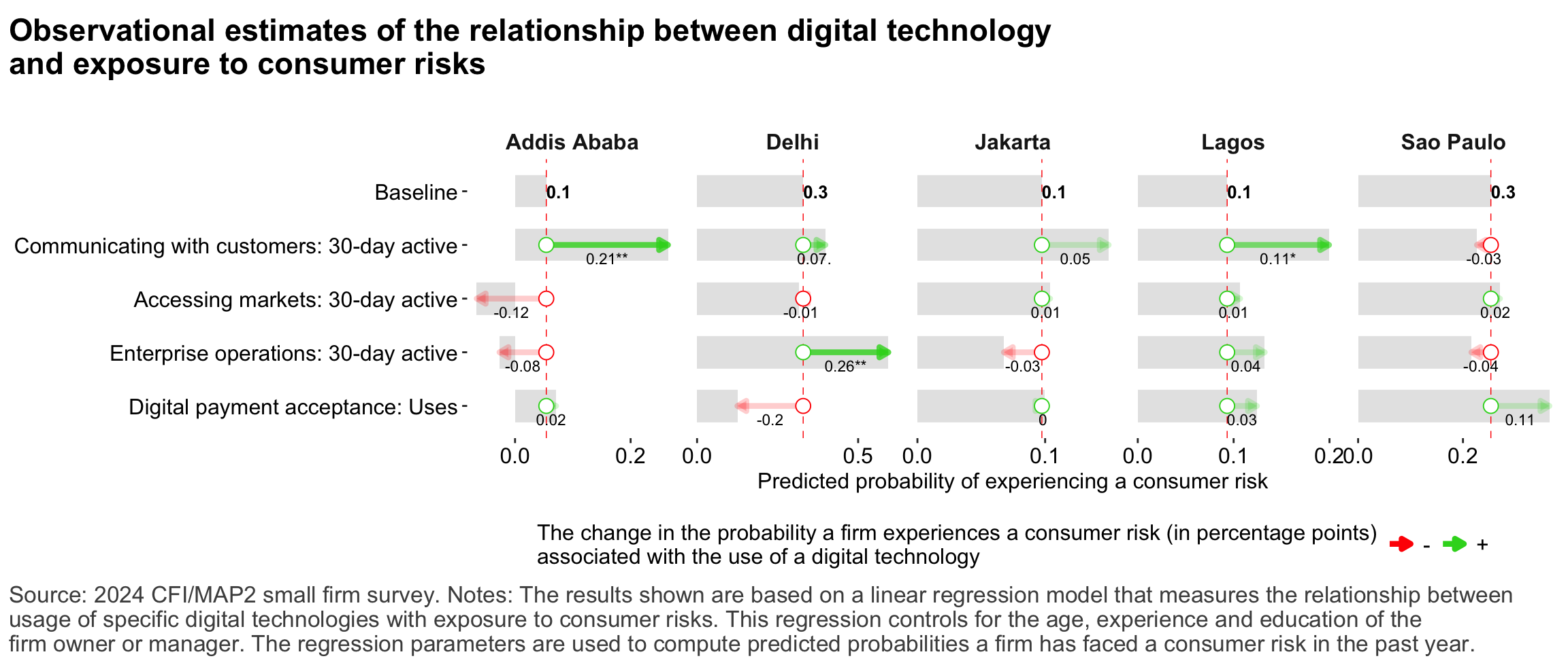 Figure 1: Businesses enumerated by sizeFigure 2: Businesses enumerated by sectorFigure 3: Businesses enumerated by sectorFigure 4: Sample characteristicsFigure 5: MSEs by sector of productionFigure 6: MSE revenues and productivityFigure 7: Changes in MSE outcomes in past yearFigure 8: MSE owner characteristicsFigure 9: Pyschographic characrteristics of SME owners or managers, by genderFigure 10: Pyschographic characrteristics of SME owners or managers, by genderFigure 11: Correlation between owner’s motivations, goals and attitudes to riskFigure 12: Summary measures of financial accessFigure 13: Access to connectivity and devicesFigure 14: Drivers of overall technology adoptionFigure 15: Applications of digital technologyFigure 16: Depth of digital technology adoptionFigure 17: Non-financial digital technology adoption factorsFigure 18: Relationship between internet-connectivity and firm-level labor productivityFigure 19: Relationship between digital technology and firm-level labor productivityFigure 20: Relationship between general digital technology adoption and subjective growthFigure 21: Relationship between digital technology adoption and firm-level labor productivityFigure 22: Relationship between digital technology adoption and firm-level labor productivityFigure 23: Relationship between depth of digital technology adoption and firm-level labor productivityFigure 24: Summary measures of financial accessFigure 25: Financical accounts and savingsFigure 26: Merchant paymentsFigure 27: Demand for creditFigure 28: Barriers to creditFigure 29: Impacts of digital financial servicesFigure 30: Insurance usageFigure 31: Relationship between financial services and firm-level labor productivityFigure 32: Relationship between financial services and financial resilienceFigure 33: Relationship between financial services and firm growthFigure 34: Relationship between financial services and capital investmentFigure 35: Challenges with loan repaymentFigure 36: Consumer protection issuesFigure 37: Consumer protection issuesFigure 38: Predictors of consumer protection risks: DemographicsFigure 39: Predictors of exposure to consumer risks: Breadth of digital technologiesFigure 40: Predictors of exposure to consumer risks: Non-financial digital technologiesFigure 41: Predictors of exposure to consumer risks: Financial servicesFigure 42: Relationship between depth of digital technology adoption and exposure to consumer protection risksFigure 43: Risks: GeneralFigure 44: Risks: ClimateFigure 45: Risks: ImpactsFigure 46: Financial resilienceFigure 47: Non-financial dimensions of business resilienceFigure 48: Access to connectivity and devicesFigure 49: Relationship between prior exposure to weather shock and investment in adaptationFigure 50: Relationship between prior exposure to weather shock and use of financial servicesFigure 51: Relationship between prior exposure to weather shock and use of digital toolsFigure 52: Relationship between overall technology adoption & resilienceFigure 53: MSEs by premises typeFigure 54: MSES by sector