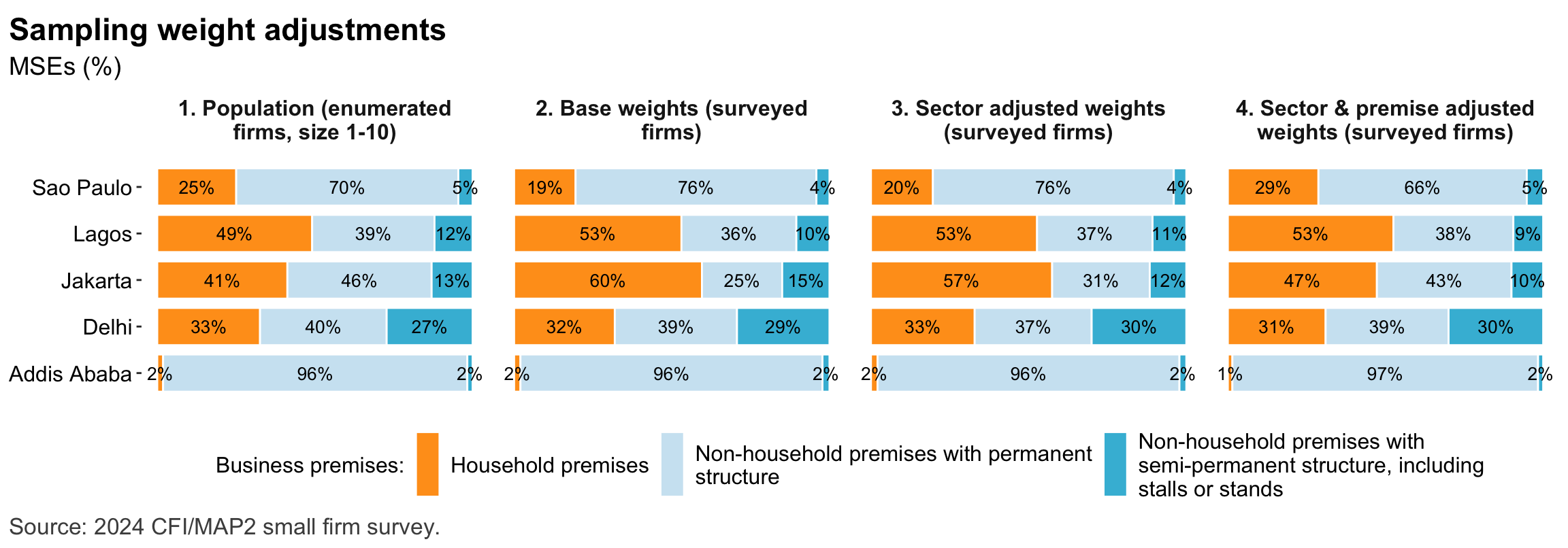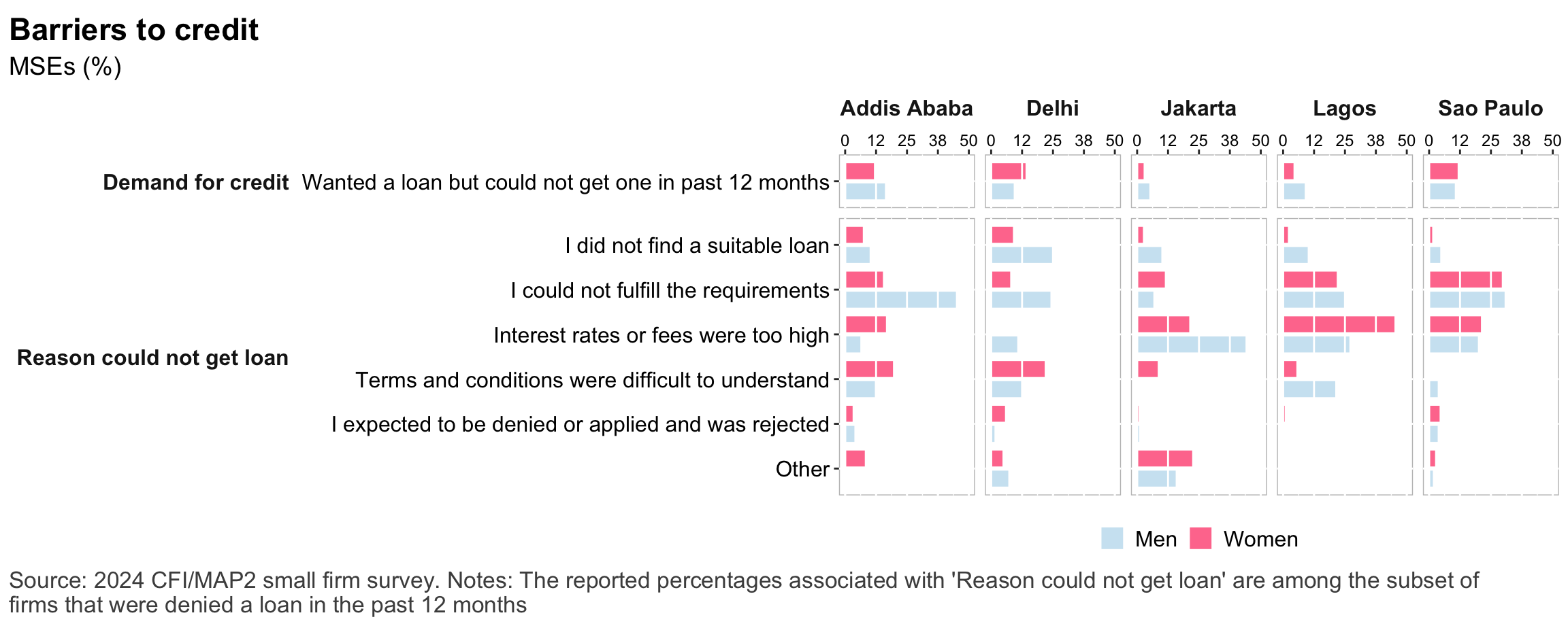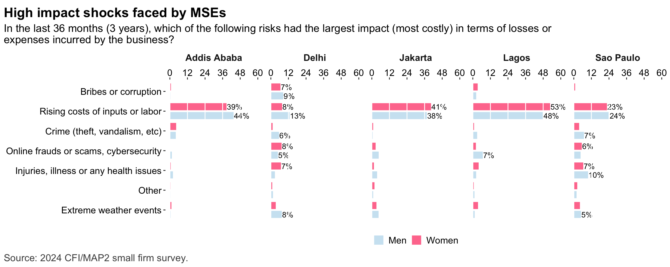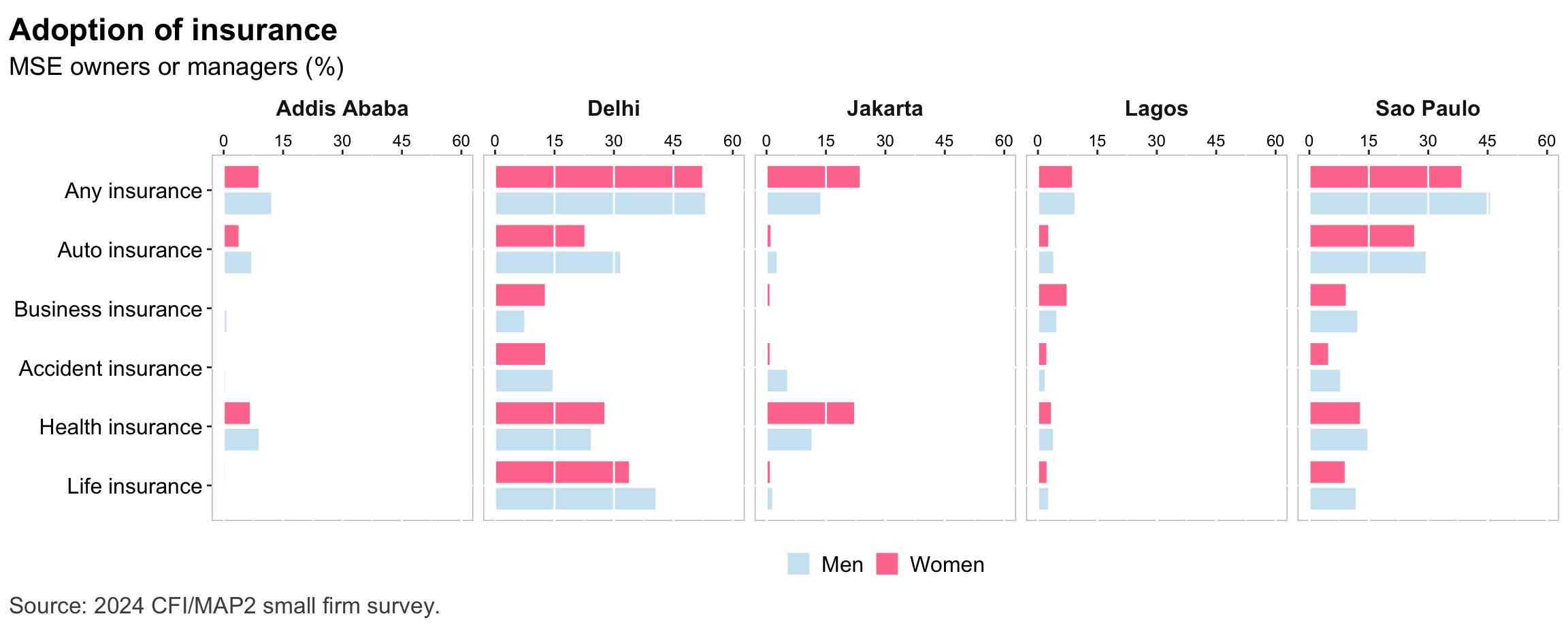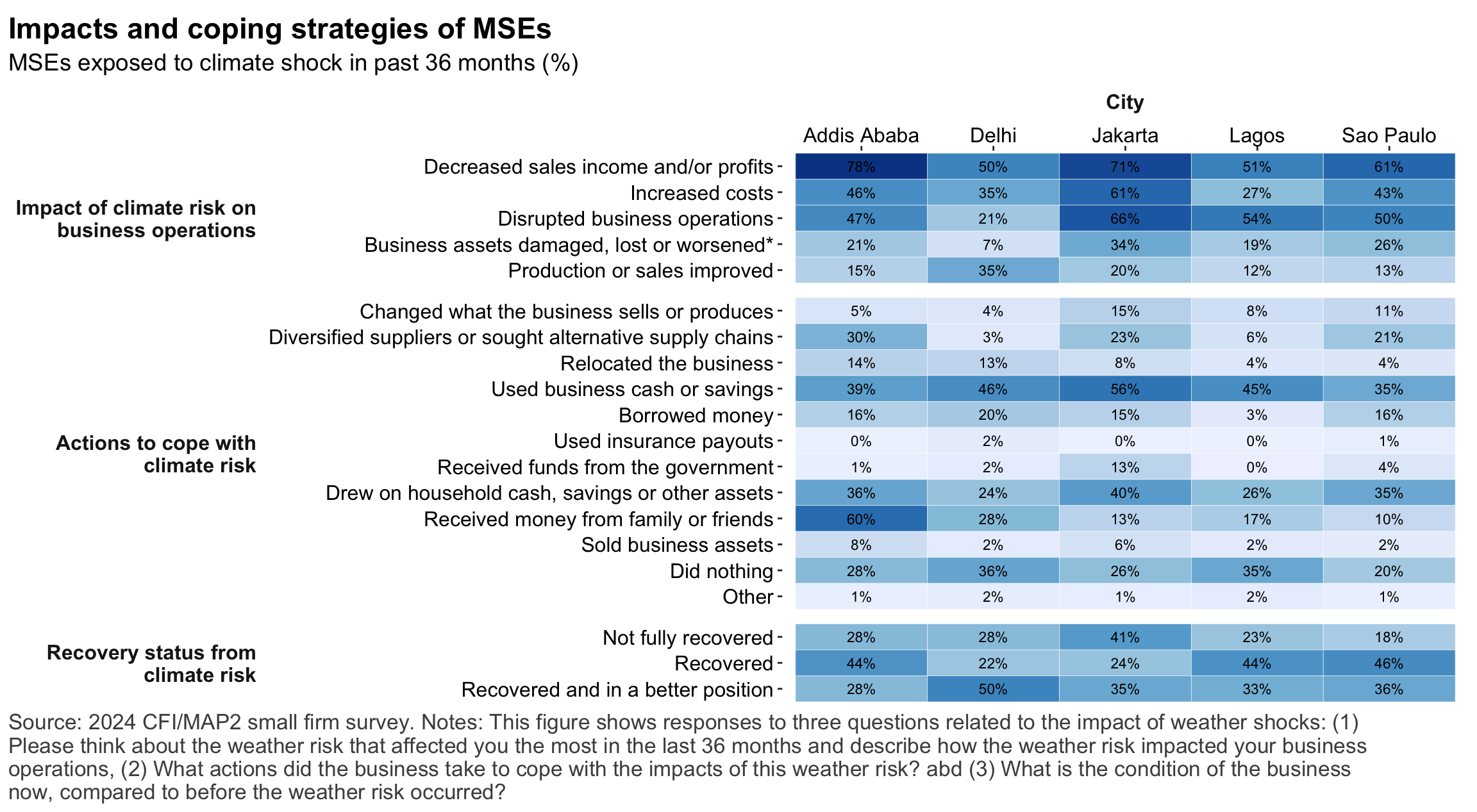 Figure 1: Businesses enumerated by sizeFigure 2: Businesses enumerated by sectorFigure 3: Businesses enumerated by sectorFigure 4: Sample characteristicsFigure 5: MSEs by sector of productionFigure 6: MSE revenues and productivityFigure 7: Changes in MSE outcomes in past yearFigure 8: MSE owner characteristicsFigure 9: Pyschographic characrteristics of SME owners or managers, by genderFigure 10: Pyschographic characrteristics of SME owners or managers, by genderFigure 11: Correlation between owner’s motivations, goals and attitudes to riskFigure 12: Summary measures of financial accessFigure 13: Access to connectivity and devicesFigure 14: Drivers of overall technology adoptionFigure 15: Applications of digital technologyFigure 16: Depth of digital technology adoptionFigure 17: Non-financial digital technology adoption factorsFigure 18: Relationship between internet-connectivity and firm-level labor productivityFigure 19: Relationship between digital technology and firm-level labor productivityFigure 20: Relationship between general digital technology adoption and subjective growthFigure 21: Relationship between digital technology adoption and firm-level labor productivityFigure 22: Relationship between digital technology adoption and firm-level labor productivityFigure 23: Relationship between depth of digital technology adoption and firm-level labor productivityFigure 24: Summary measures of financial accessFigure 25: Financical accounts and savingsFigure 26: Merchant paymentsFigure 27: Demand for creditFigure 28: Barriers to creditFigure 29: Impacts of digital financial servicesFigure 30: Insurance usageFigure 31: Relationship between financial services and firm-level labor productivityFigure 32: Relationship between financial services and financial resilienceFigure 33: Relationship between financial services and firm growthFigure 34: Relationship between financial services and capital investmentFigure 35: Challenges with loan repaymentFigure 36: Consumer protection issuesFigure 37: Consumer protection issuesFigure 38: Predictors of consumer protection risks: DemographicsFigure 39: Predictors of exposure to consumer risks: Breadth of digital technologiesFigure 40: Predictors of exposure to consumer risks: Non-financial digital technologiesFigure 41: Predictors of exposure to consumer risks: Financial servicesFigure 42: Relationship between depth of digital technology adoption and exposure to consumer protection risksFigure 43: Risks: GeneralFigure 44: Risks: ClimateFigure 45: Risks: ImpactsFigure 46: Financial resilienceFigure 47: Non-financial dimensions of business resilienceFigure 48: Access to connectivity and devicesFigure 49: Relationship between prior exposure to weather shock and investment in adaptationFigure 50: Relationship between prior exposure to weather shock and use of financial servicesFigure 51: Relationship between prior exposure to weather shock and use of digital toolsFigure 52: Relationship between overall technology adoption & resilienceFigure 53: MSEs by premises typeFigure 54: MSES by sector